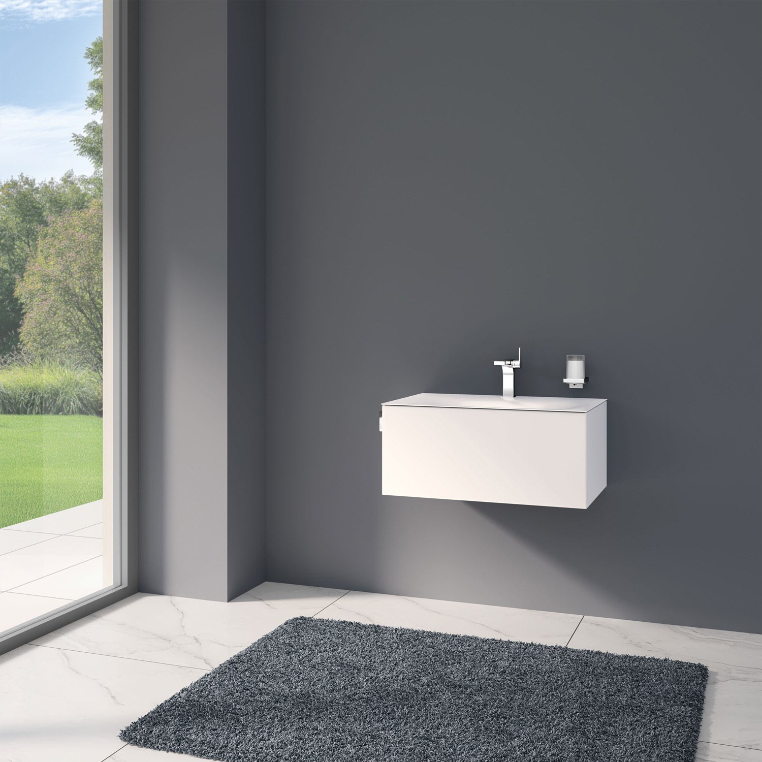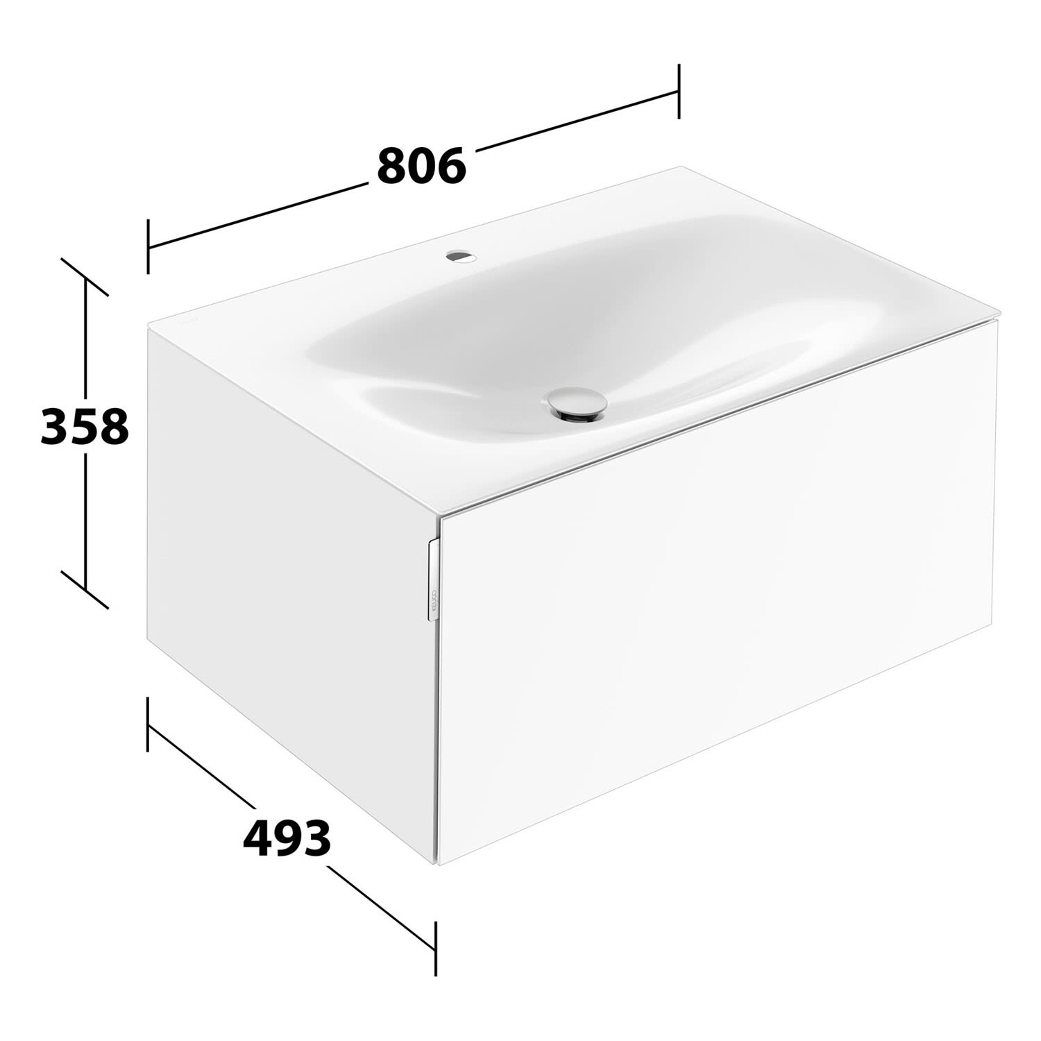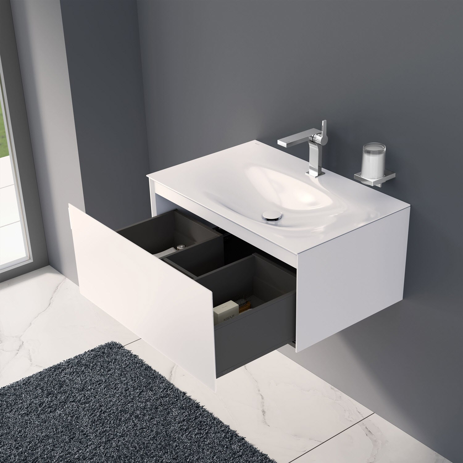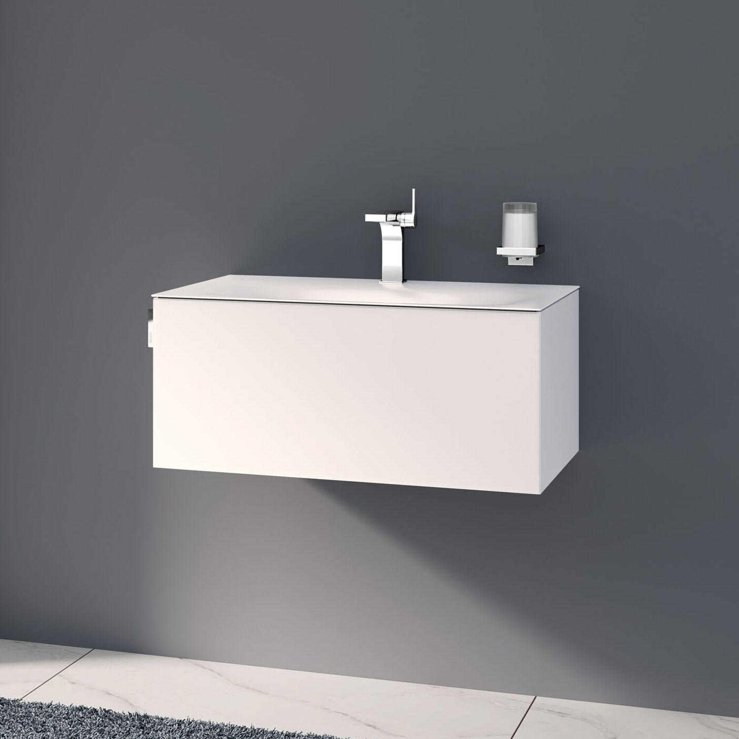 Der Unterschrank ist vormontiert und verfügt über einen geräumigen Auszug mit einer Front aus Glas und einem seitlich angebrachten Griff. Die seidenmatte Lackoberfläche des Möbels betont die feine Architektur und ergänzt die softe Optik des Waschtisches.