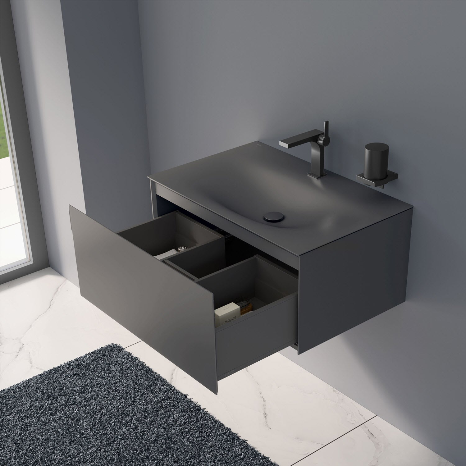 Der Unterschrank ist vormontiert und verfügt über einen geräumigen Auszug mit einer Front aus Glas und einem seitlich angebrachten Griff. Die seidenmatte Lackoberfläche des Möbels betont die feine Architektur und ergänzt die softe Optik des Waschtisches.