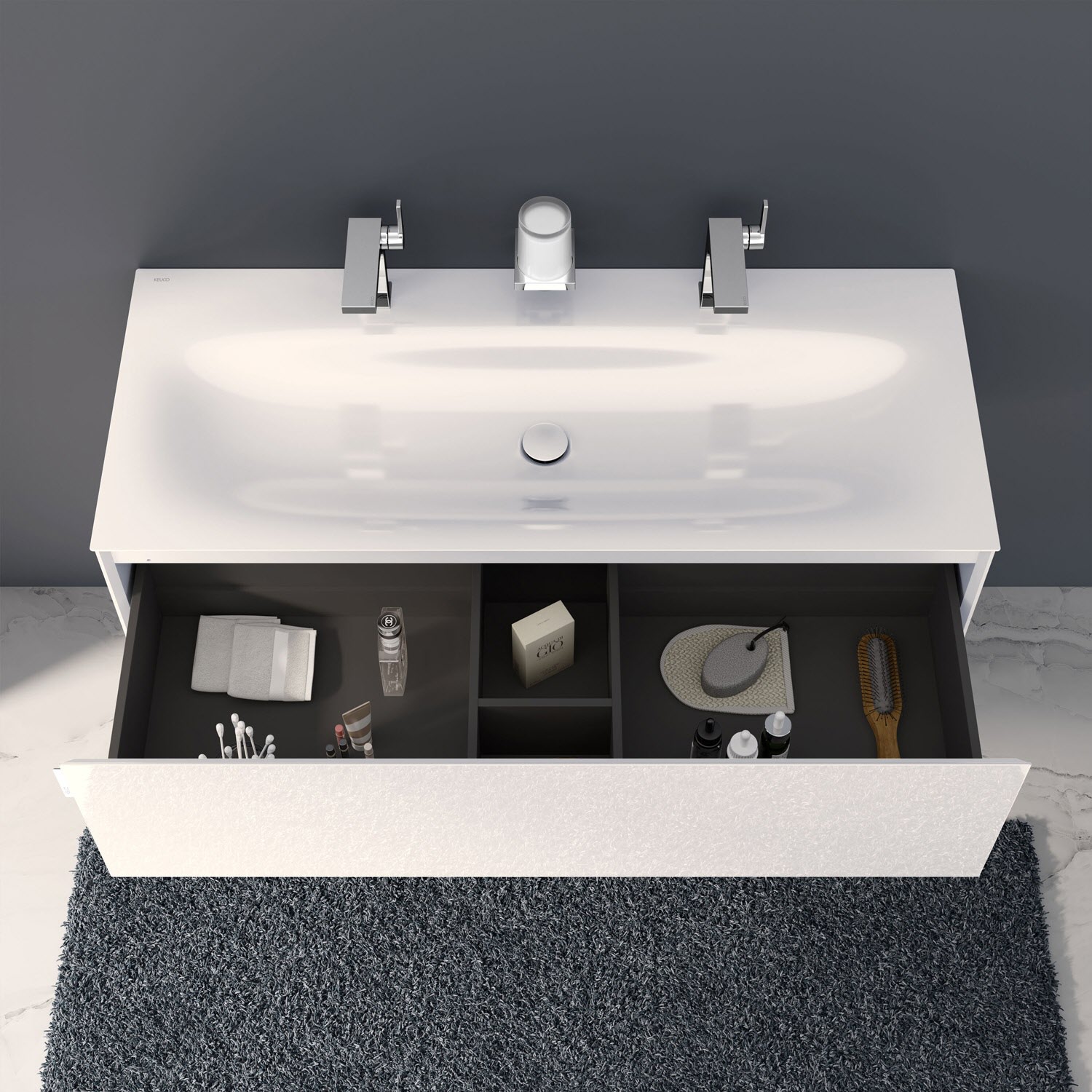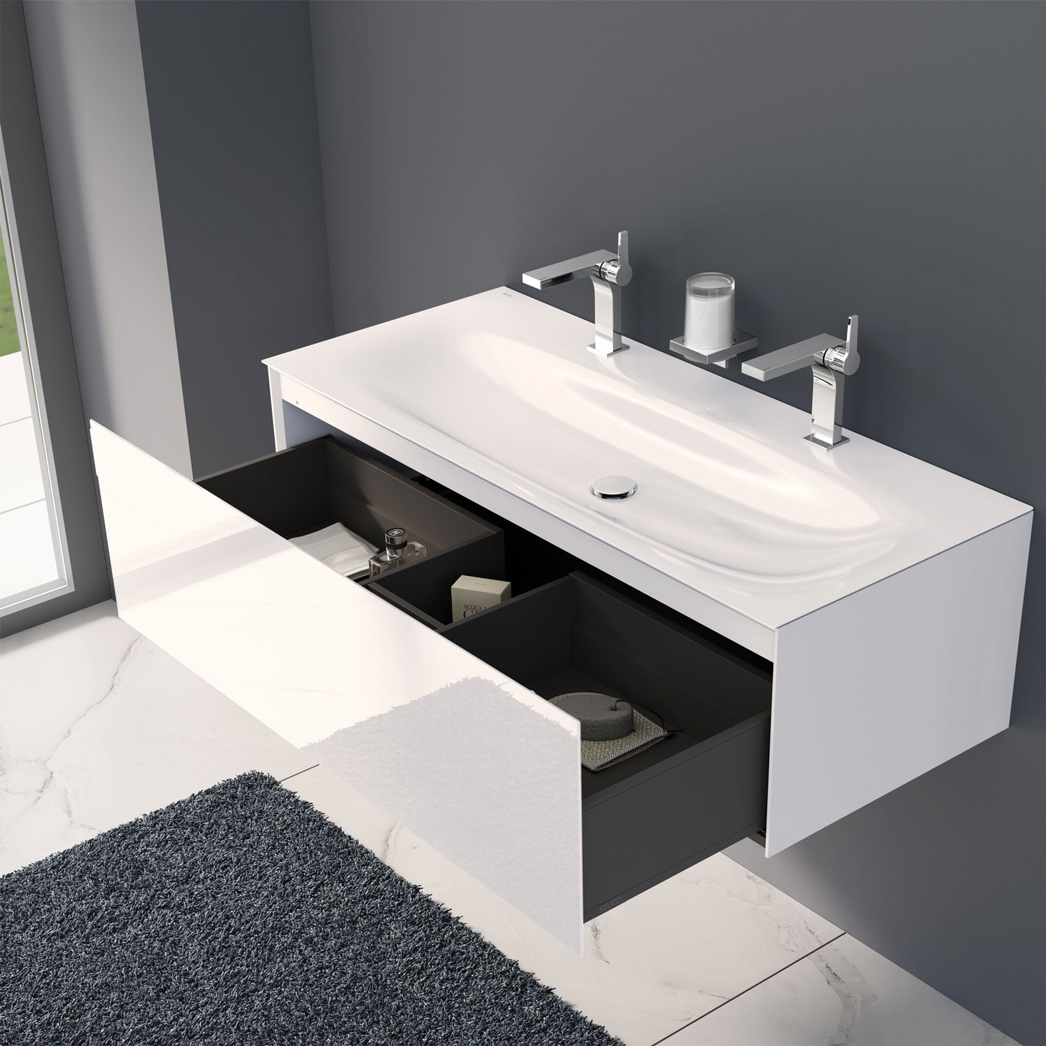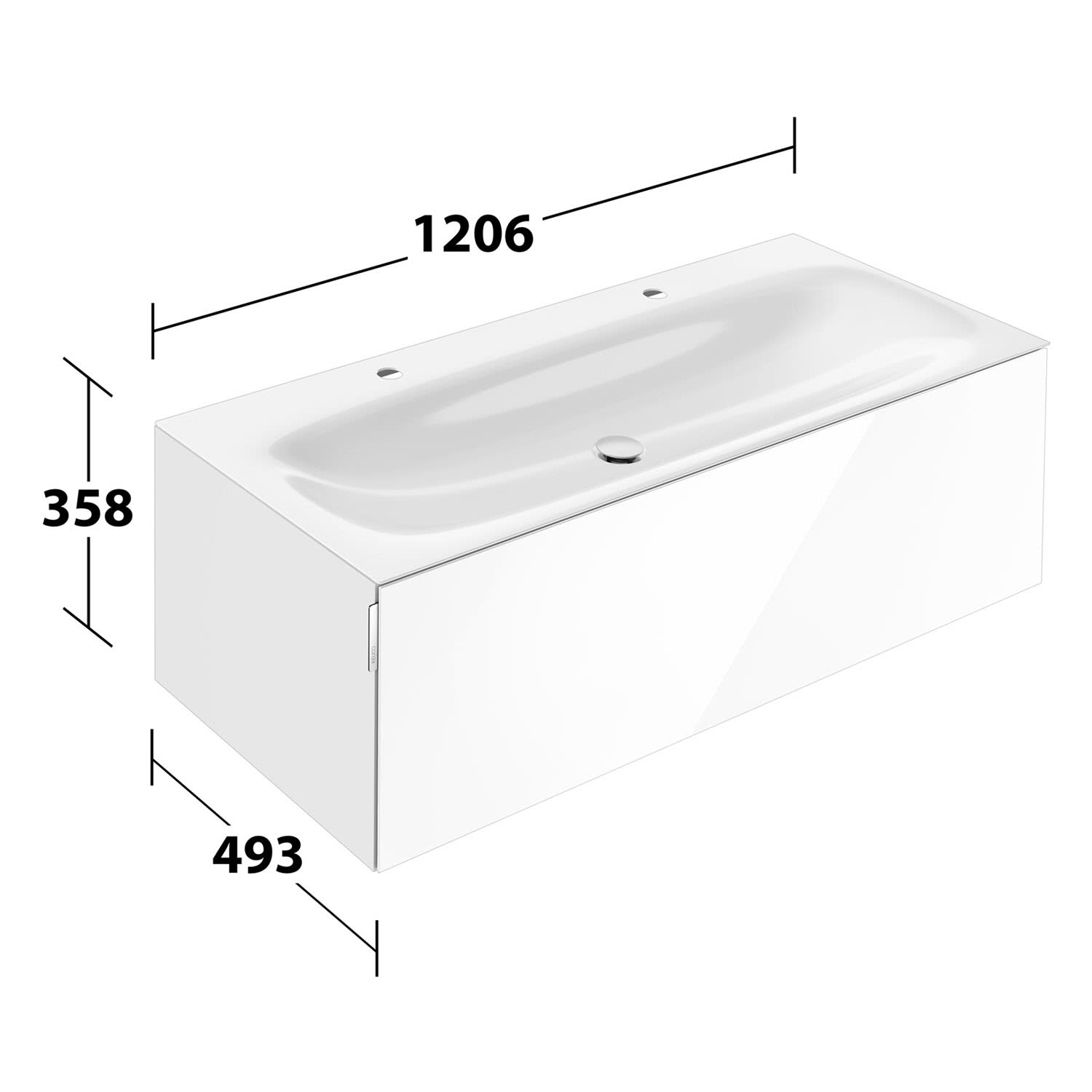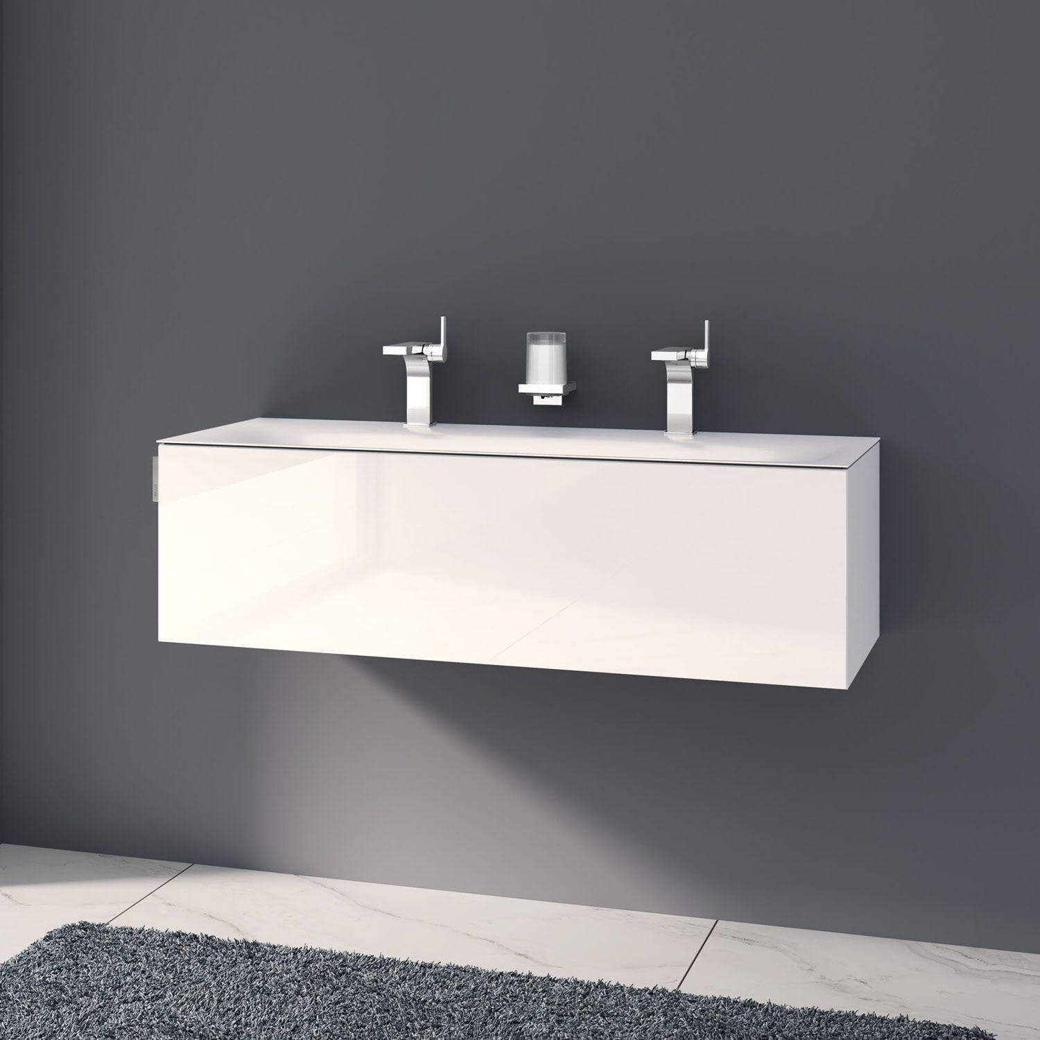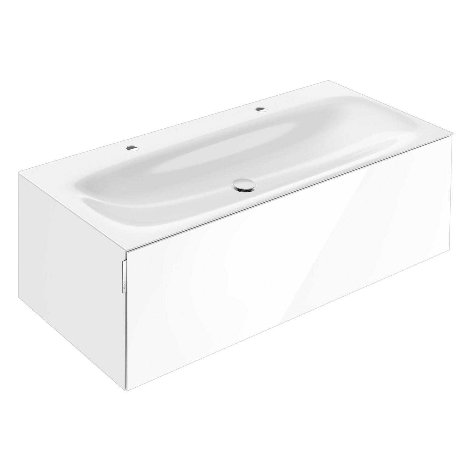 Keuco EDITION 11 Art Emaille-Doppelwaschtisch mit Waschtischunterschrank und Schaftventil, 1 Auszug, 2 Hahnlöcher, 120 cm