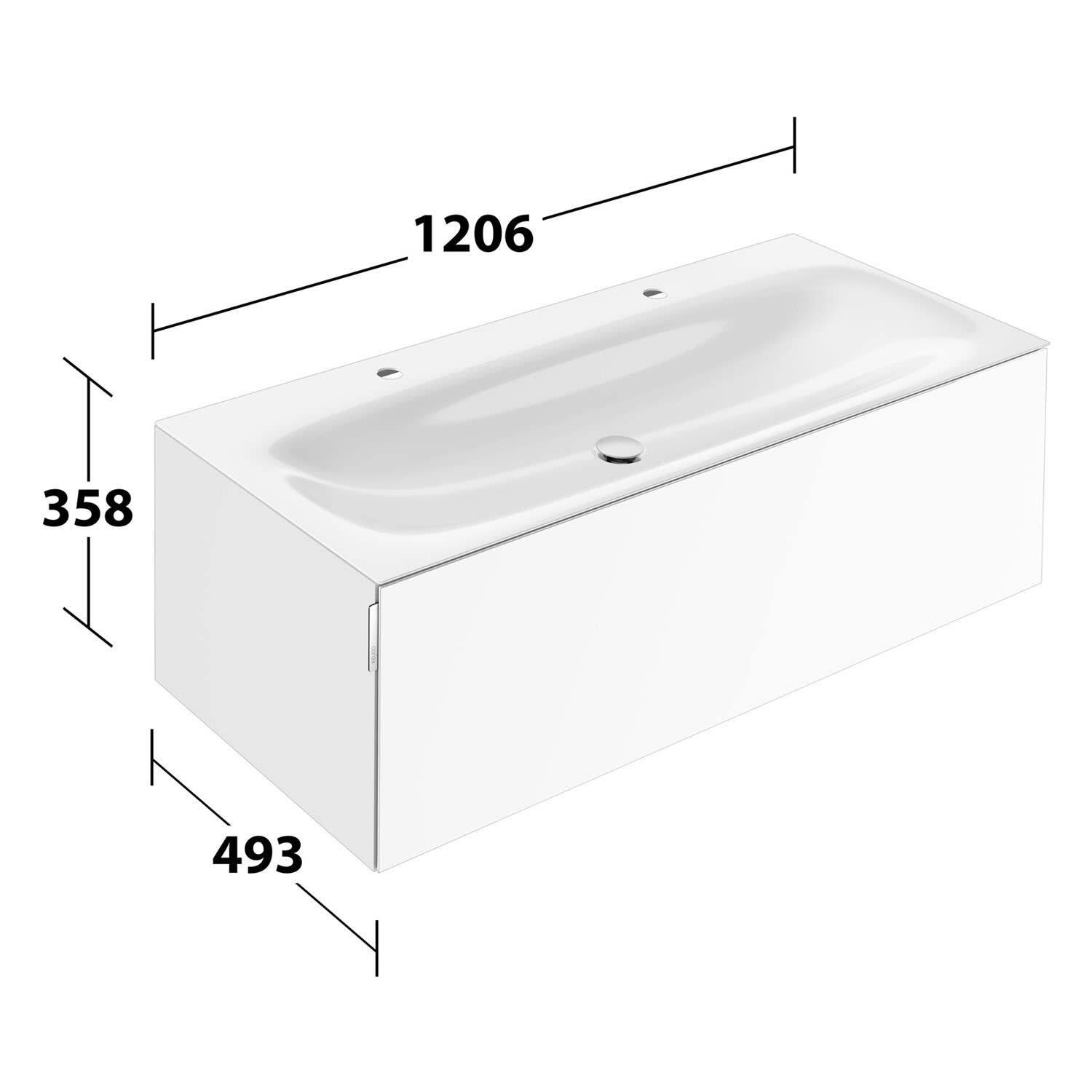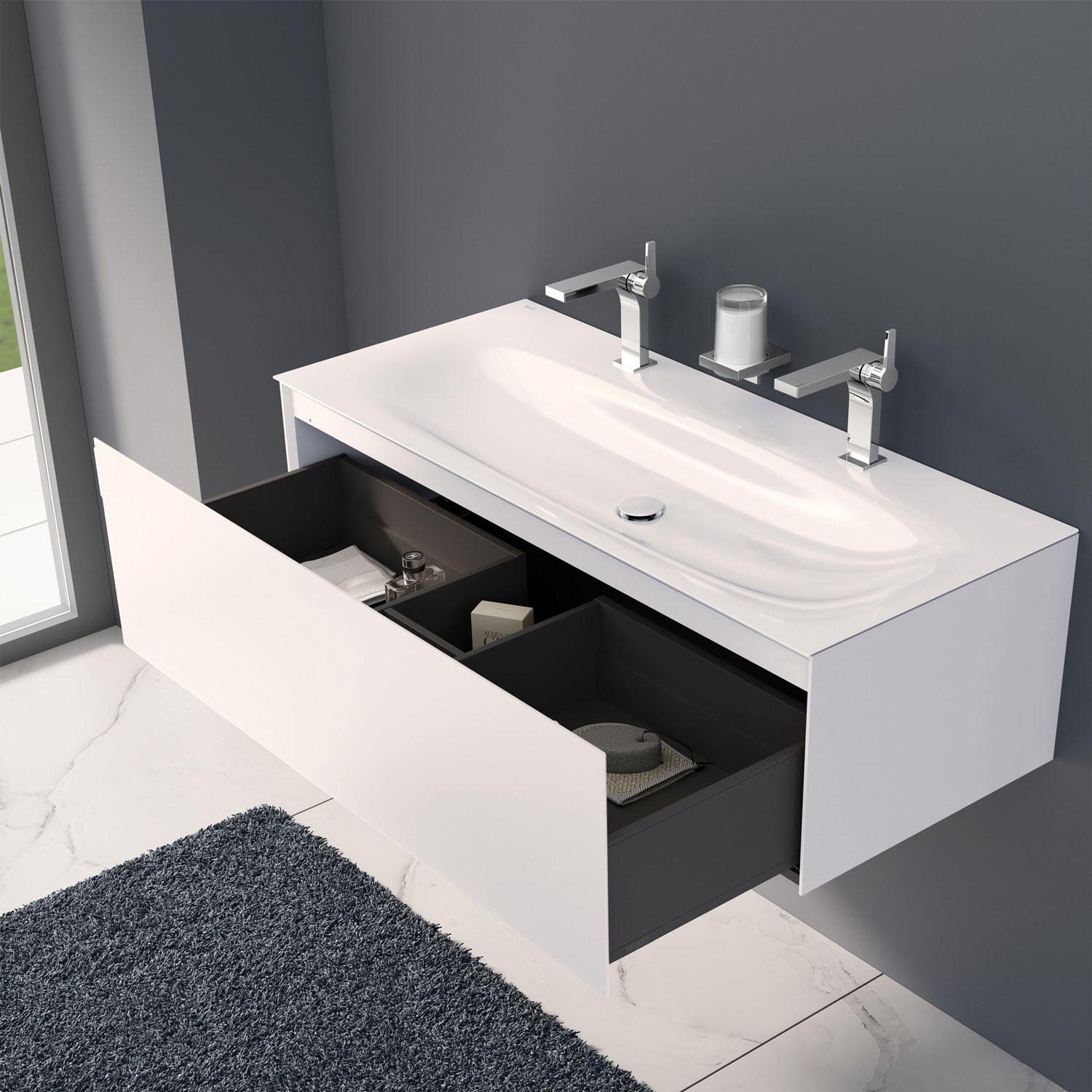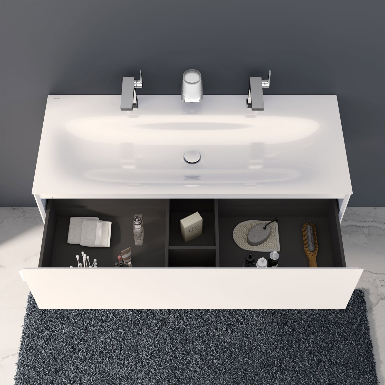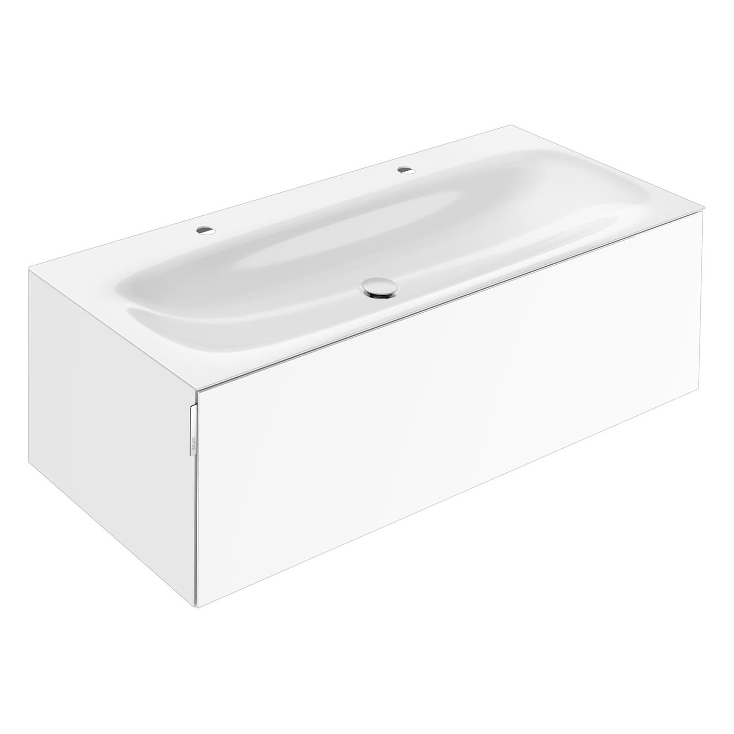Keuco EDITION 11 Art Emaille-Doppelwaschtisch mit Waschtischunterschrank und Schaftventil, 1 Auszug, 2 Hahnlöcher, 120 cm