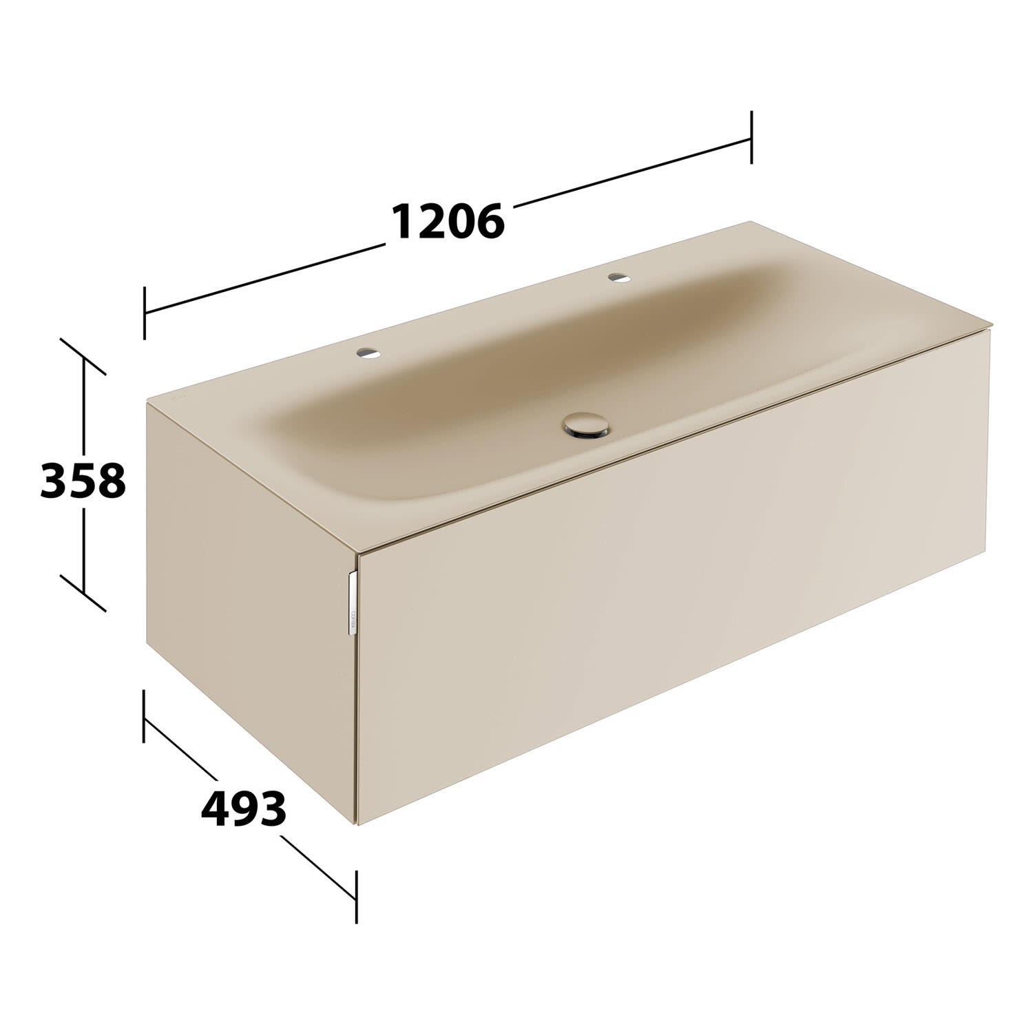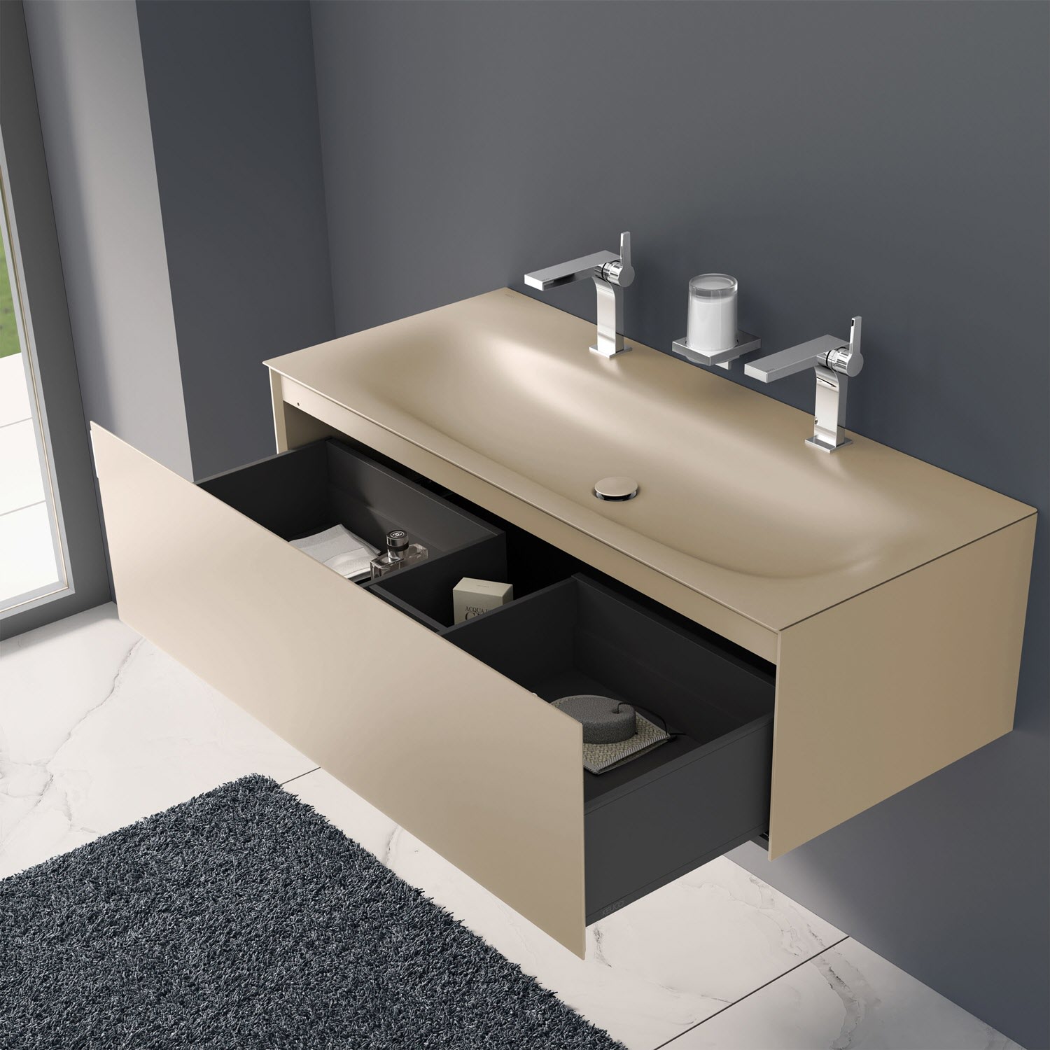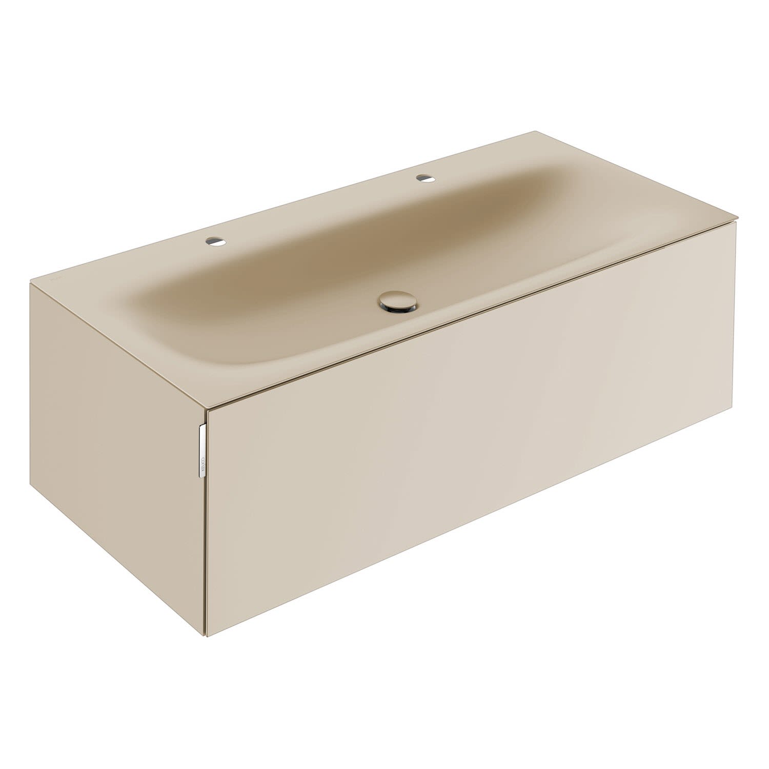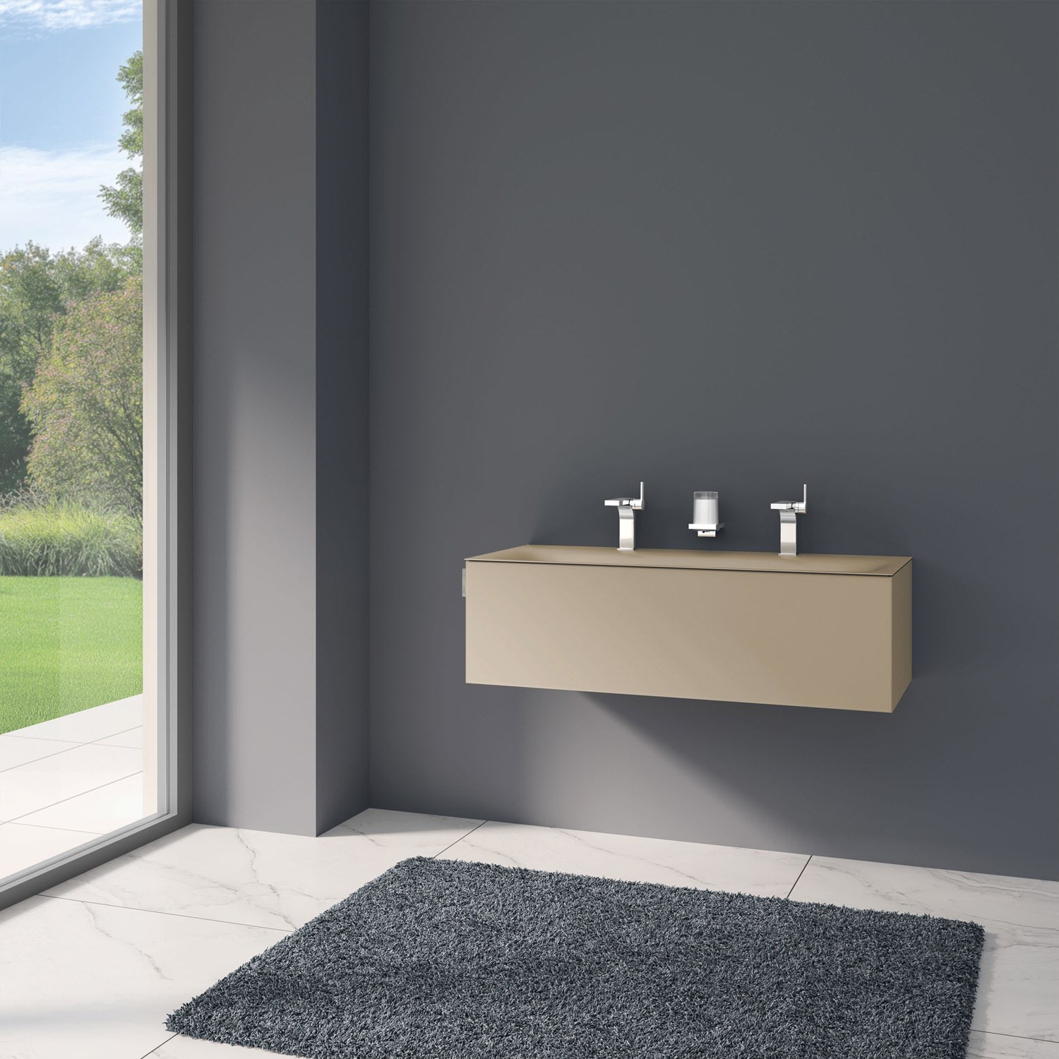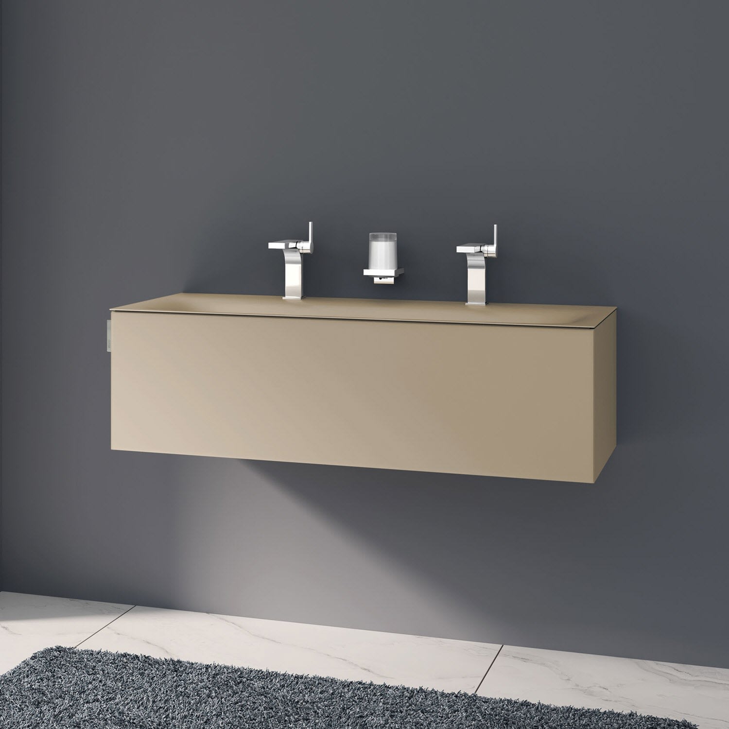 Der Unterschrank ist vormontiert und verfügt über einen geräumigen Auszug mit einer Front aus Glas und einem seitlich angebrachten Griff. Die seidenmatte Lackoberfläche des Möbels betont die feine Architektur und ergänzt die softe Optik des Waschtisches.