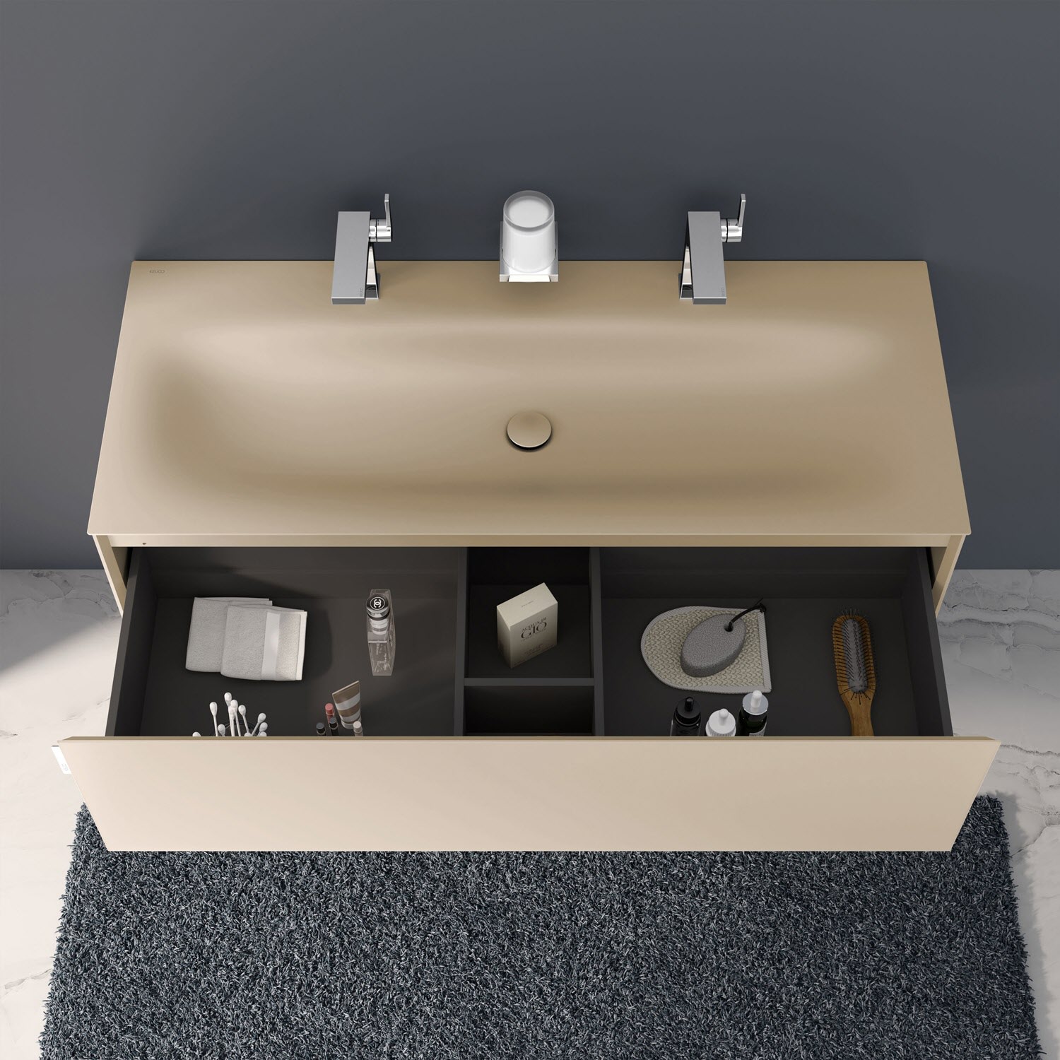 Keuco EDITION 11 Art Emaille-Doppelwaschtisch mit Waschtischunterschrank und Schaftventil, 1 Auszug, 2 Hahnlöcher, 120 cm