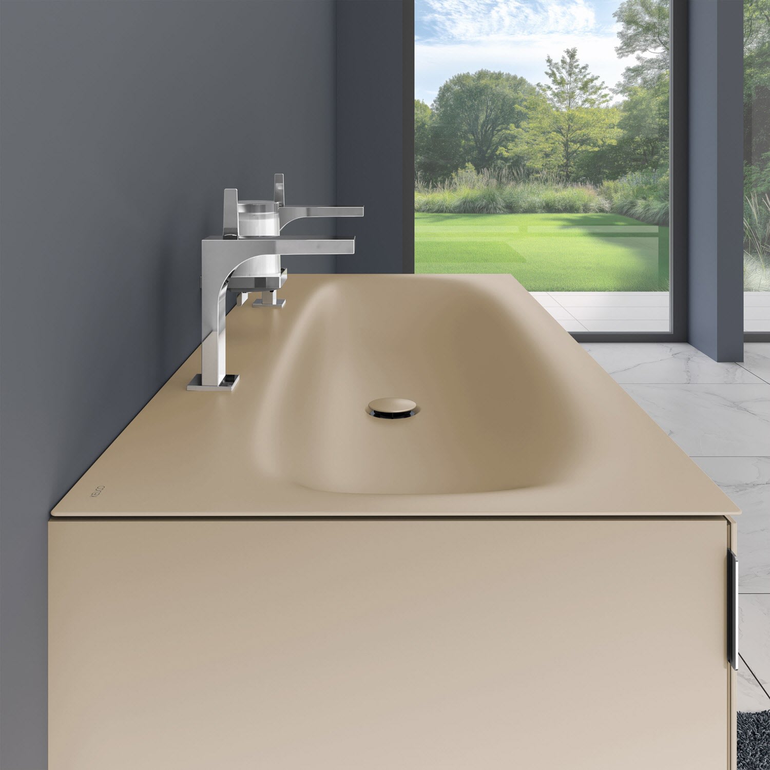 Der Waschtisch besteht aus glasiertem Titanstahl, wodurch er äußerst robust ist. Die porenfreie Emaille-Oberfläche bietet Schmutz und Bakterien kaum Angriffsfläche und lässt sich sehr leicht reinigen. Seine filigranen Kanten von extrem schlanken 4 mm verschmelzen nahezu mit dem Waschtischunterbau und erzeugen einen einzigartigen Look, bei der Möbel und Waschtisch wie aus einem Guss wirken. Das mitgelieferte Schaftventil ist farblich zum Waschtisch abgestimmt.