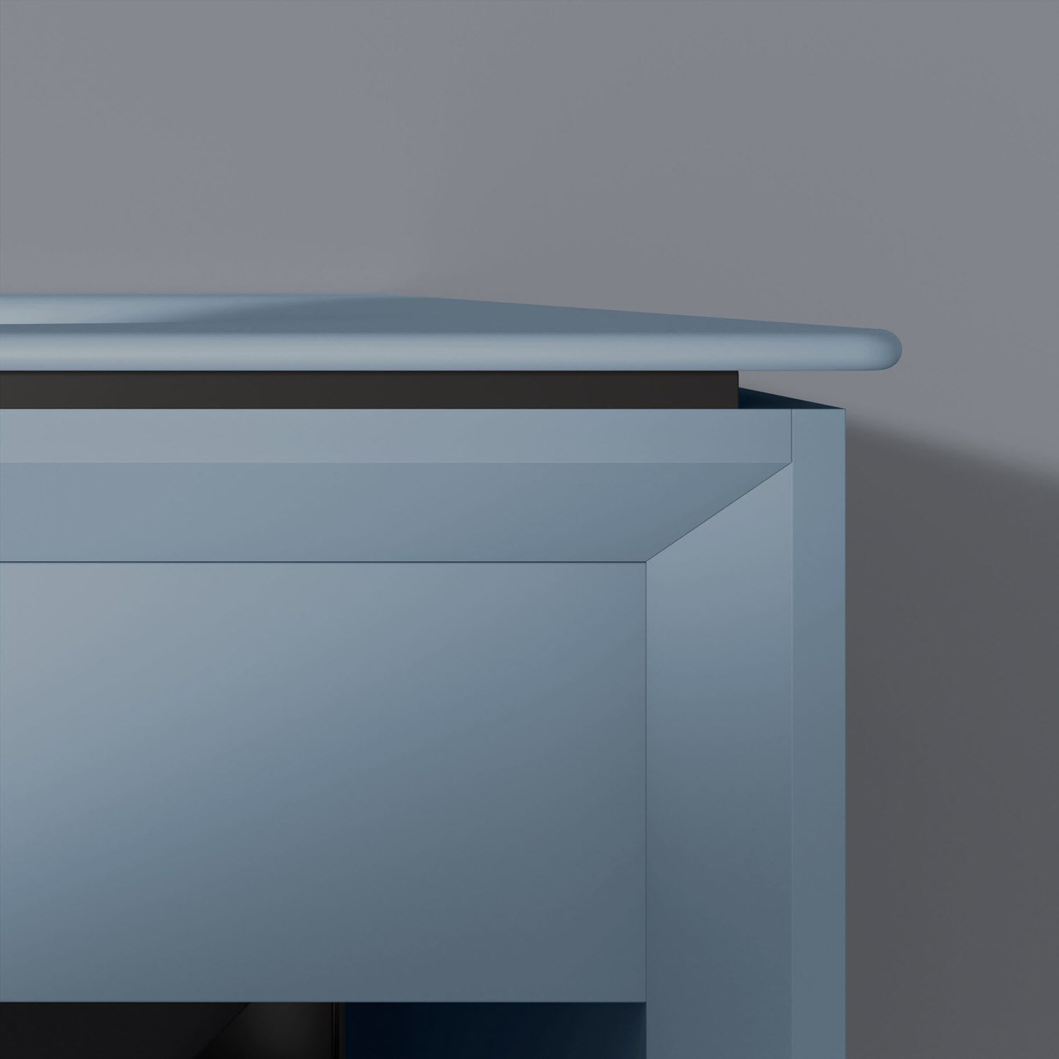 Der Waschtisch besteht aus glasiertem Titanstahl, wodurch er äußerst robust ist. Die porenfreie Emaille-Oberfläche bietet Schmutz und Bakterien kaum Angriffsfläche und lässt sich sehr leicht reinigen. Seine filigranen Kanten von extrem schlanken 4 mm verschmelzen nahezu mit dem Waschtischunterbau und erzeugen einen einzigartigen Look, bei der Möbel und Waschtisch wie aus einem Guss wirken. Das mitgelieferte Schaftventil ist farblich zum Waschtisch abgestimmt.
