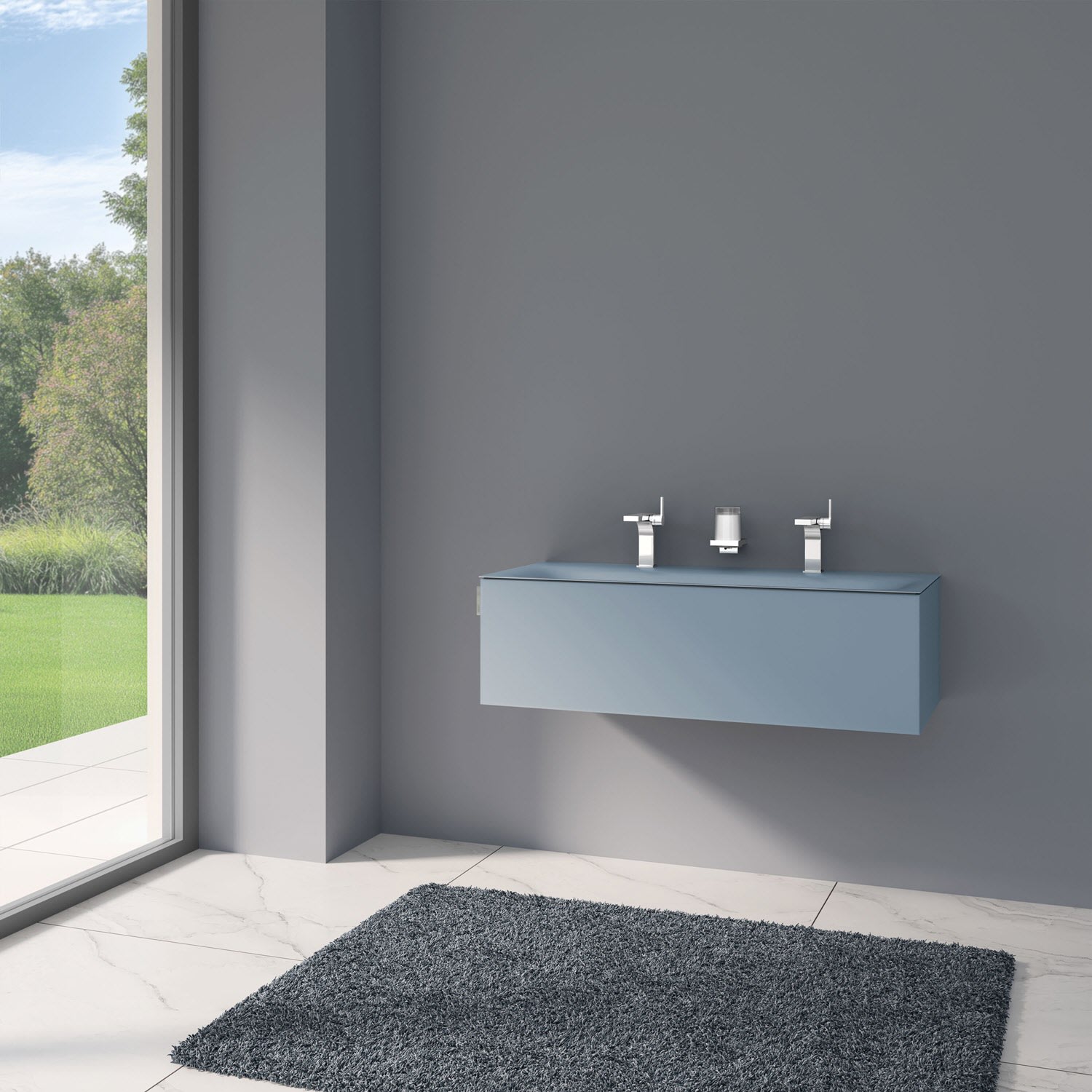 Der Unterschrank ist vormontiert und verfügt über einen geräumigen Auszug mit einer Front aus Glas und einem seitlich angebrachten Griff. Die seidenmatte Lackoberfläche des Möbels betont die feine Architektur und ergänzt die softe Optik des Waschtisches.
