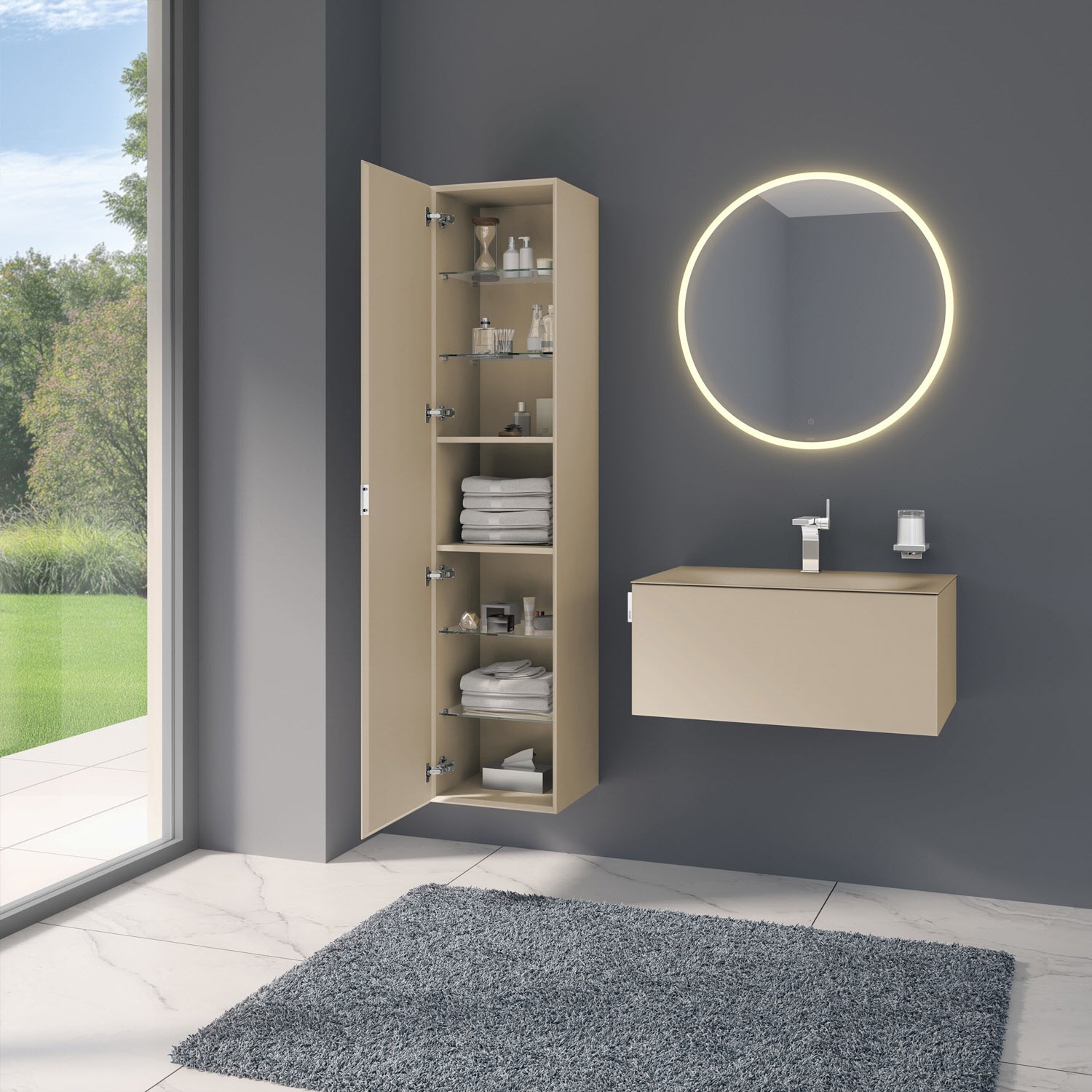 Der Hochschrank der Serie zeigt Größe mit seinem Stauraum über mehrere Ebenen: Zwei feste Böden bilden das mittlere Fach, während vier Glasböden zusätzlichen Stauraum bieten. Einstellbare Türdämpfer sorgen für sanftes Schließen. Der Hochschrank ist wahlweise mit einem Spiegel auf der Türinnenseite und Steckdose im mittleren Fach oder ohne diese Ausstattungen erhältlich.