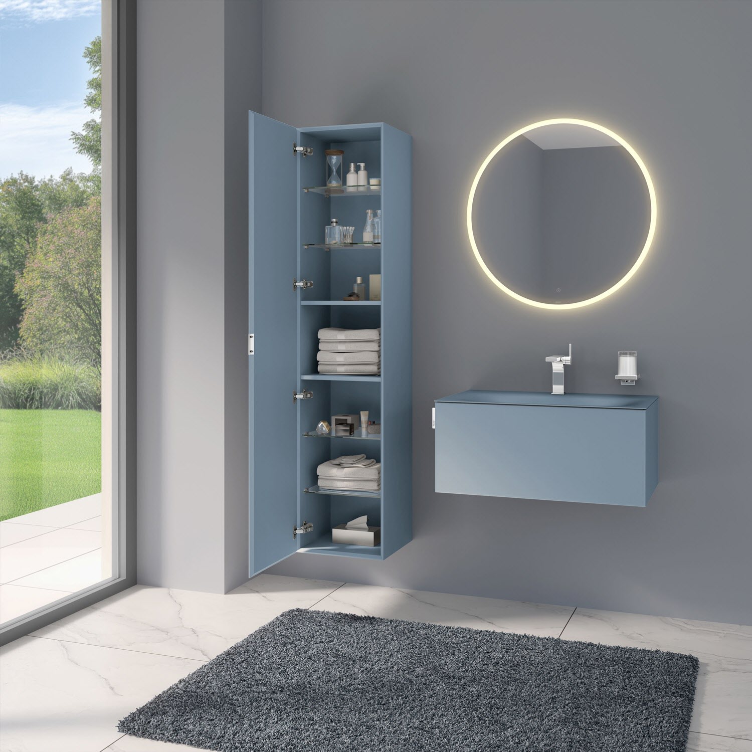 Der Hochschrank der Serie zeigt Größe mit seinem Stauraum über mehrere Ebenen: Zwei feste Böden bilden das mittlere Fach, während vier Glasböden zusätzlichen Stauraum bieten. Einstellbare Türdämpfer sorgen für sanftes Schließen. Der Hochschrank ist wahlweise mit einem Spiegel auf der Türinnenseite und Steckdose im mittleren Fach oder ohne diese Ausstattungen erhältlich.