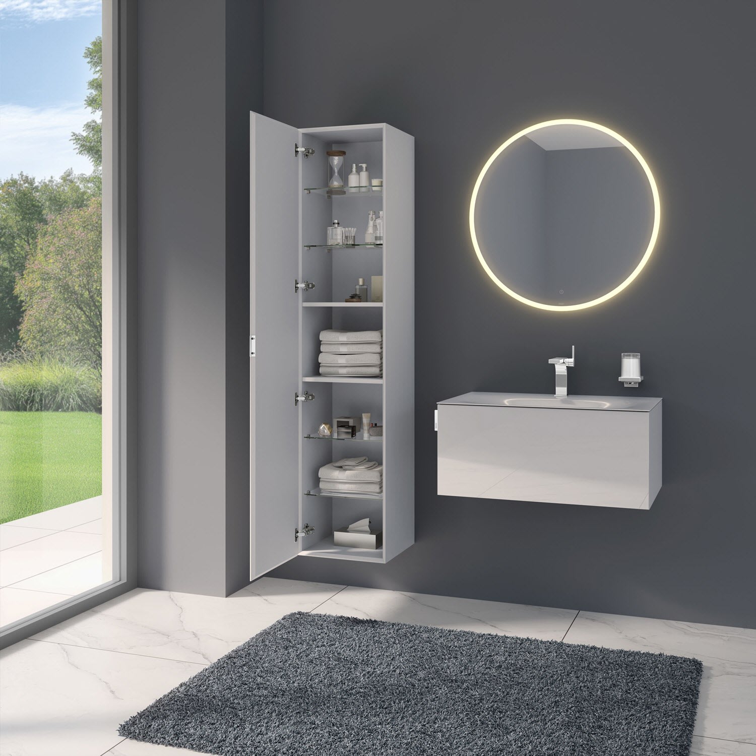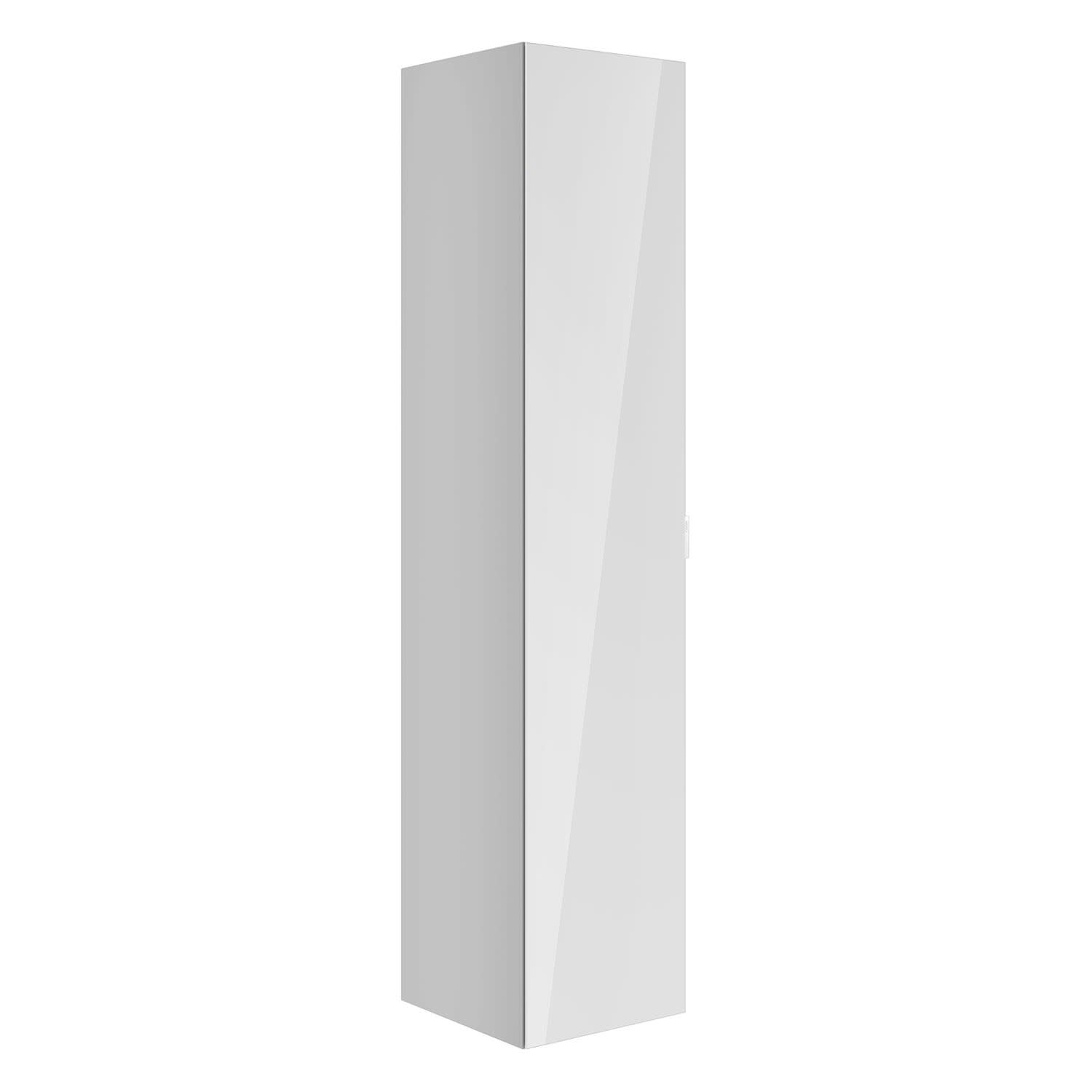 Der Hochschrank der Serie zeigt Größe mit seinem Stauraum über mehrere Ebenen: Zwei feste Böden bilden das mittlere Fach, während vier Glasböden zusätzlichen Stauraum bieten. Einstellbare Türdämpfer sorgen für sanftes Schließen. Der Hochschrank ist wahlweise mit einem Spiegel auf der Türinnenseite und Steckdose im mittleren Fach oder ohne diese Ausstattungen erhältlich.
