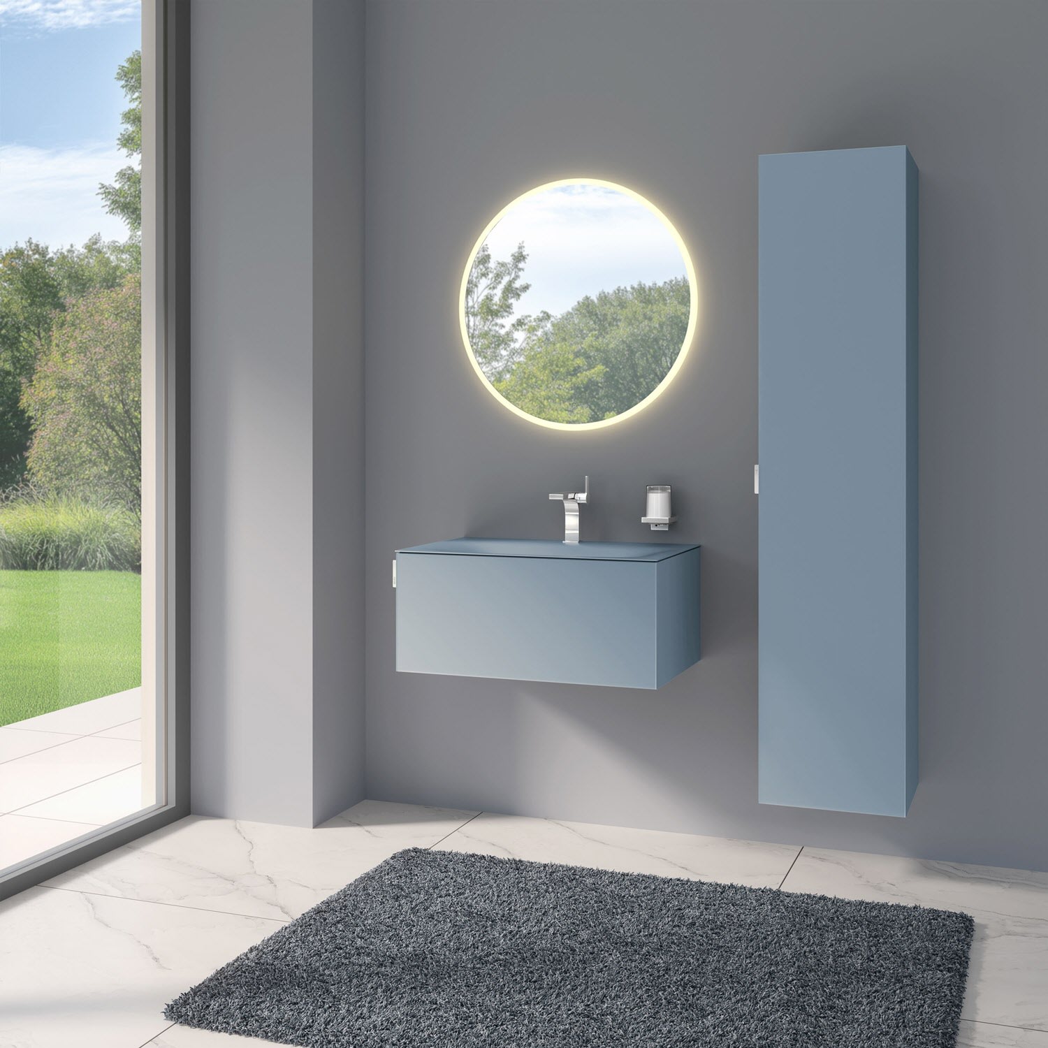 Der Hochschrank der Serie zeigt Größe mit seinem Stauraum über mehrere Ebenen: Zwei feste Böden bilden das mittlere Fach, während vier Glasböden zusätzlichen Stauraum bieten. Einstellbare Türdämpfer sorgen für sanftes Schließen. Der Hochschrank ist wahlweise mit einem Spiegel auf der Türinnenseite und Steckdose im mittleren Fach oder ohne diese Ausstattungen erhältlich.
