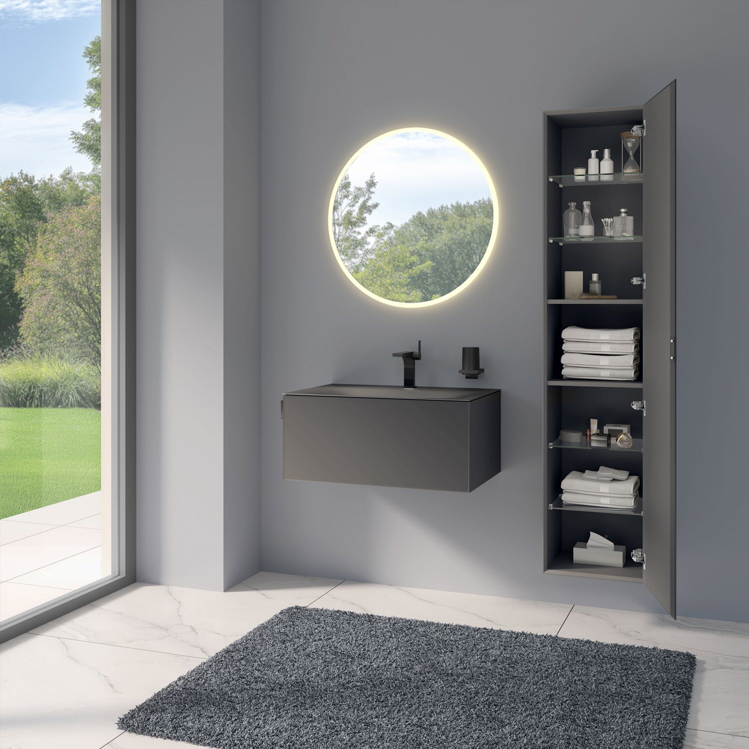 Der Hochschrank der Serie zeigt Größe mit seinem Stauraum über mehrere Ebenen: Zwei feste Böden bilden das mittlere Fach, während vier Glasböden zusätzlichen Stauraum bieten. Einstellbare Türdämpfer sorgen für sanftes Schließen. Der Hochschrank ist wahlweise mit einem Spiegel auf der Türinnenseite und Steckdose im mittleren Fach oder ohne diese Ausstattungen erhältlich.