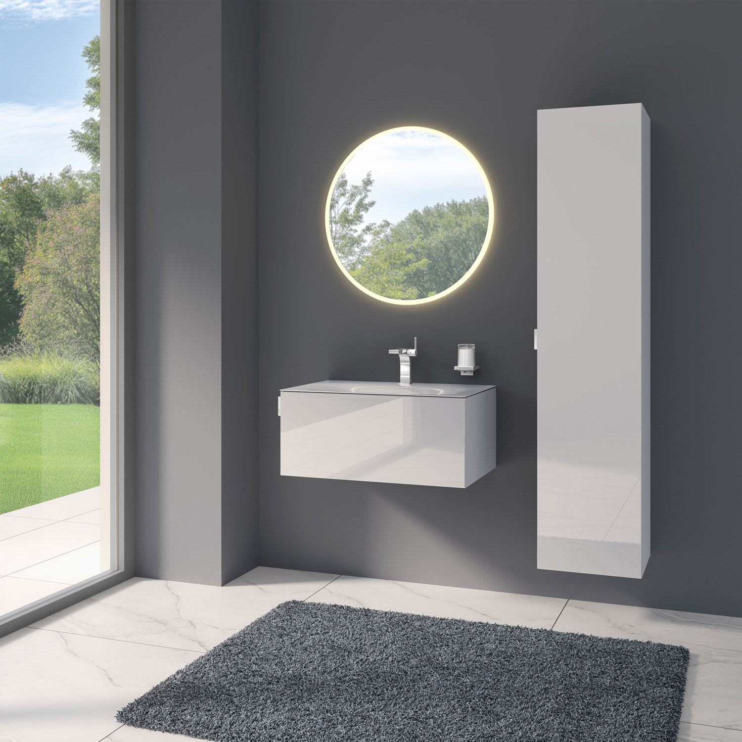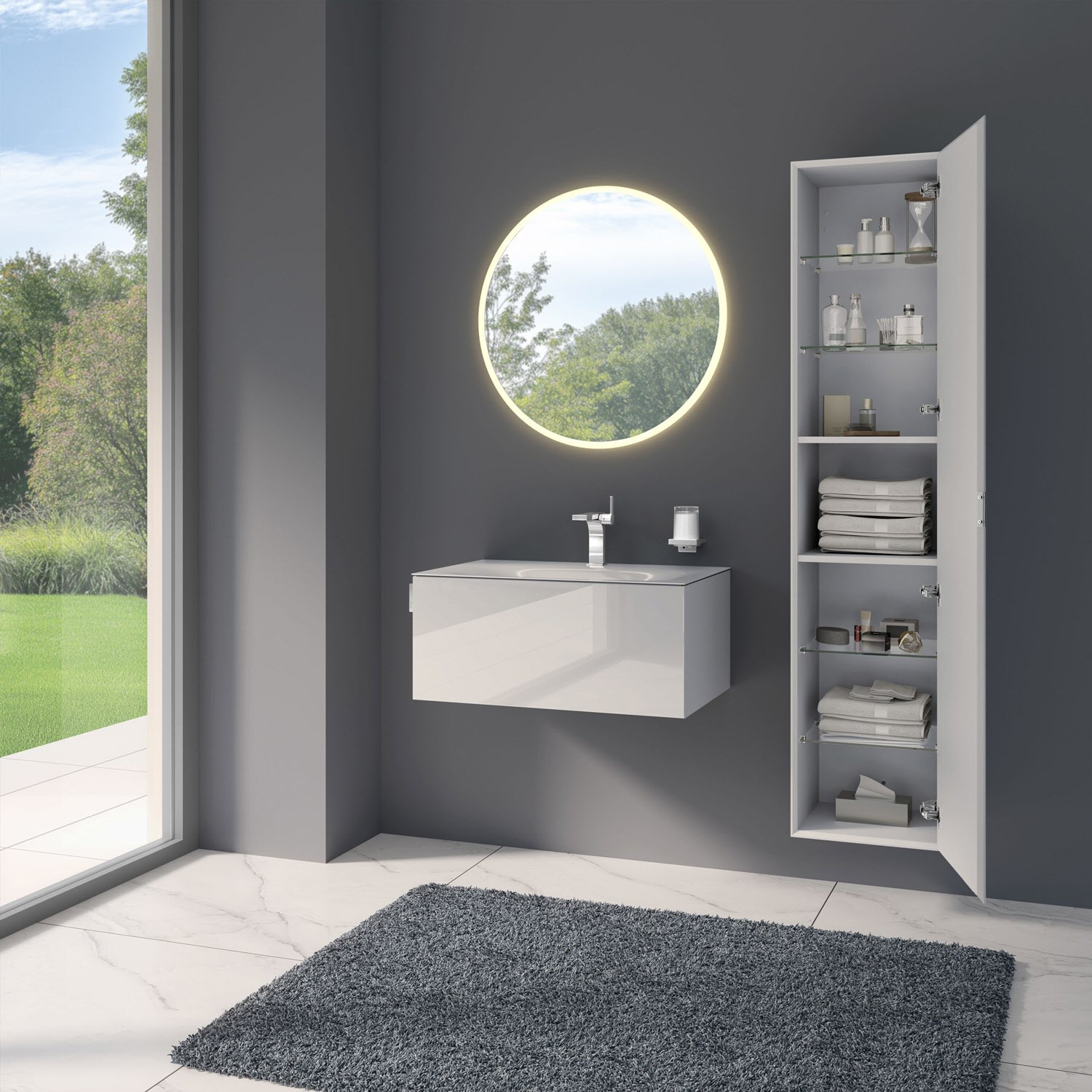 Der Hochschrank der Serie zeigt Größe mit seinem Stauraum über mehrere Ebenen: Zwei feste Böden bilden das mittlere Fach, während vier Glasböden zusätzlichen Stauraum bieten. Einstellbare Türdämpfer sorgen für sanftes Schließen. Der Hochschrank ist wahlweise mit einem Spiegel auf der Türinnenseite und Steckdose im mittleren Fach oder ohne diese Ausstattungen erhältlich.