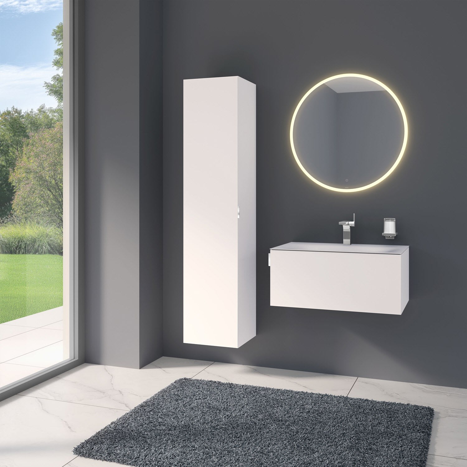 Der Hochschrank der Serie zeigt Größe mit seinem Stauraum über mehrere Ebenen: Zwei feste Böden bilden das mittlere Fach, während vier Glasböden zusätzlichen Stauraum bieten. Einstellbare Türdämpfer sorgen für sanftes Schließen. Der Hochschrank ist wahlweise mit einem Spiegel auf der Türinnenseite und Steckdose im mittleren Fach oder ohne diese Ausstattungen erhältlich.