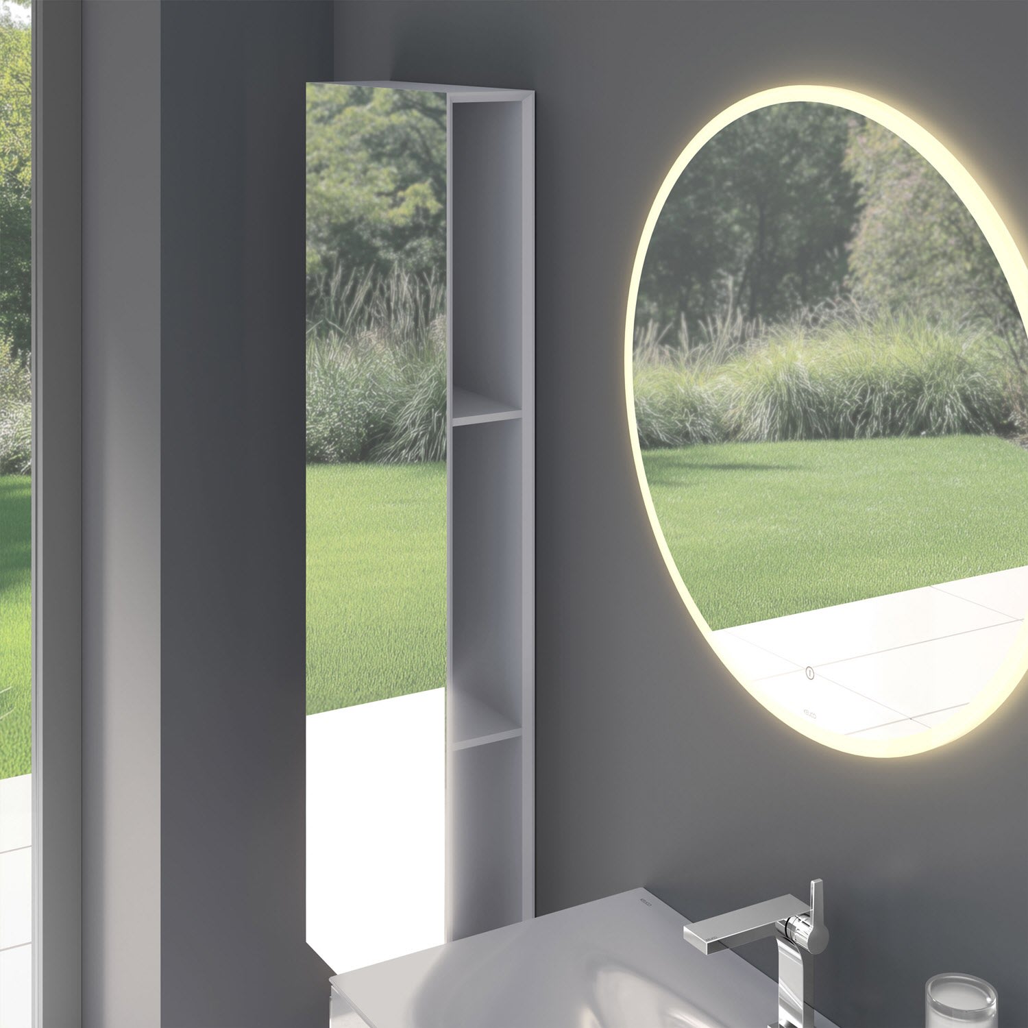 Hinter der verspiegelten Fläche verbirgt sich großzügiger Stauraum: Das Regal mit seitlichen Fächern erlaubt direkten Zugang zu Pflegemitteln, Beauty-Artikeln oder Handtüchern. Von vorne absolut aufgeräumt, sorgt es für einen harmonischen Gesamteindruck des Raumes.