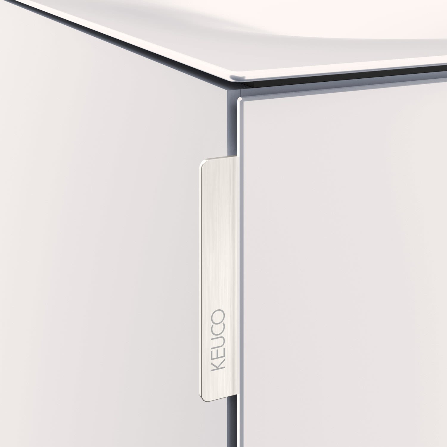 Das durchdachte Farbkonzept der EDITION 11 Art reicht bis ins kleinste Detail. Der seitliche Griff an den Möbeln ist in den gleichen Oberflächen erhältlich wie verschiedene Armaturen und Accessoires von Keuco.
