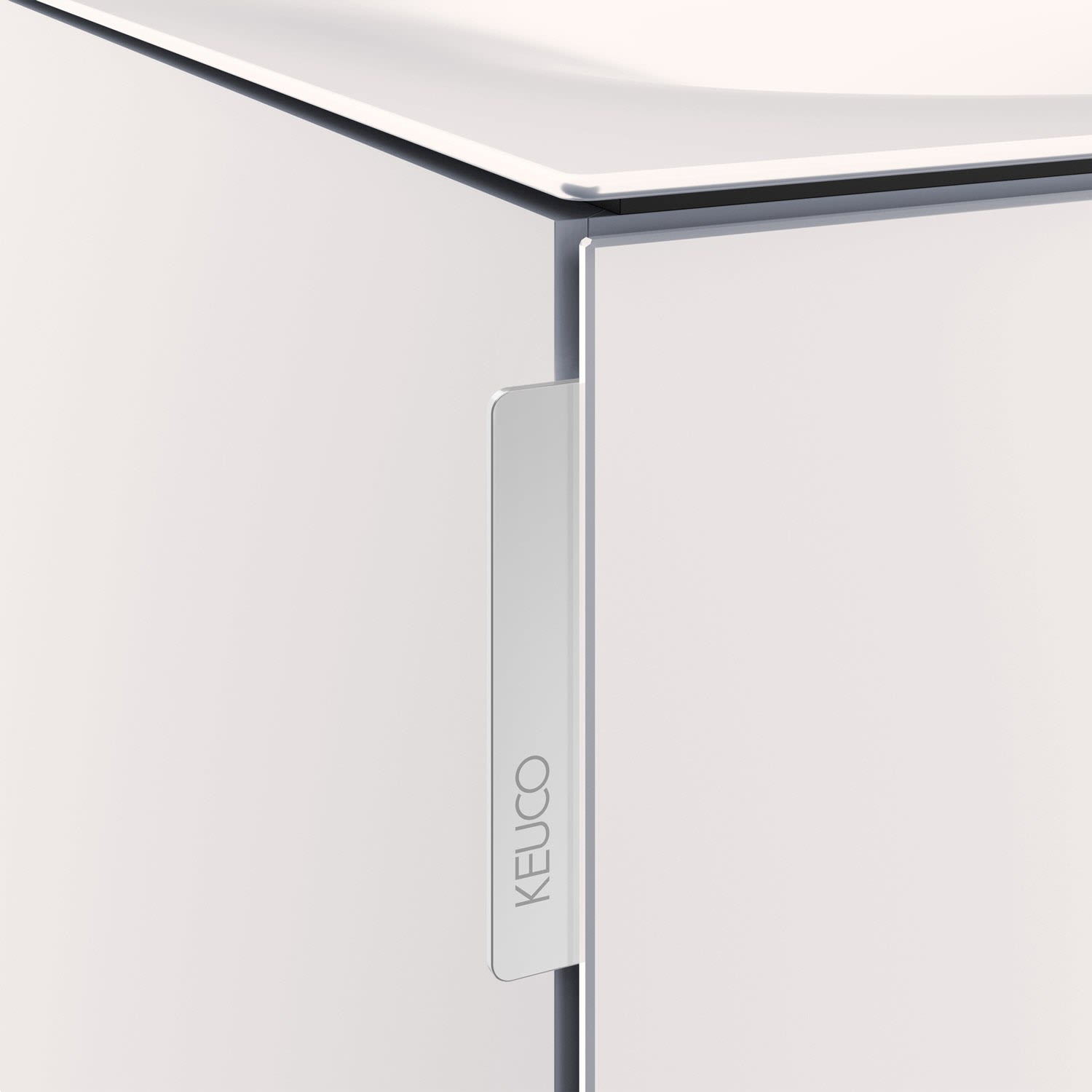 Das durchdachte Farbkonzept der EDITION 11 Art reicht bis ins kleinste Detail. Der seitliche Griff an den Möbeln ist in den gleichen Oberflächen erhältlich wie verschiedene Armaturen und Accessoires von Keuco.