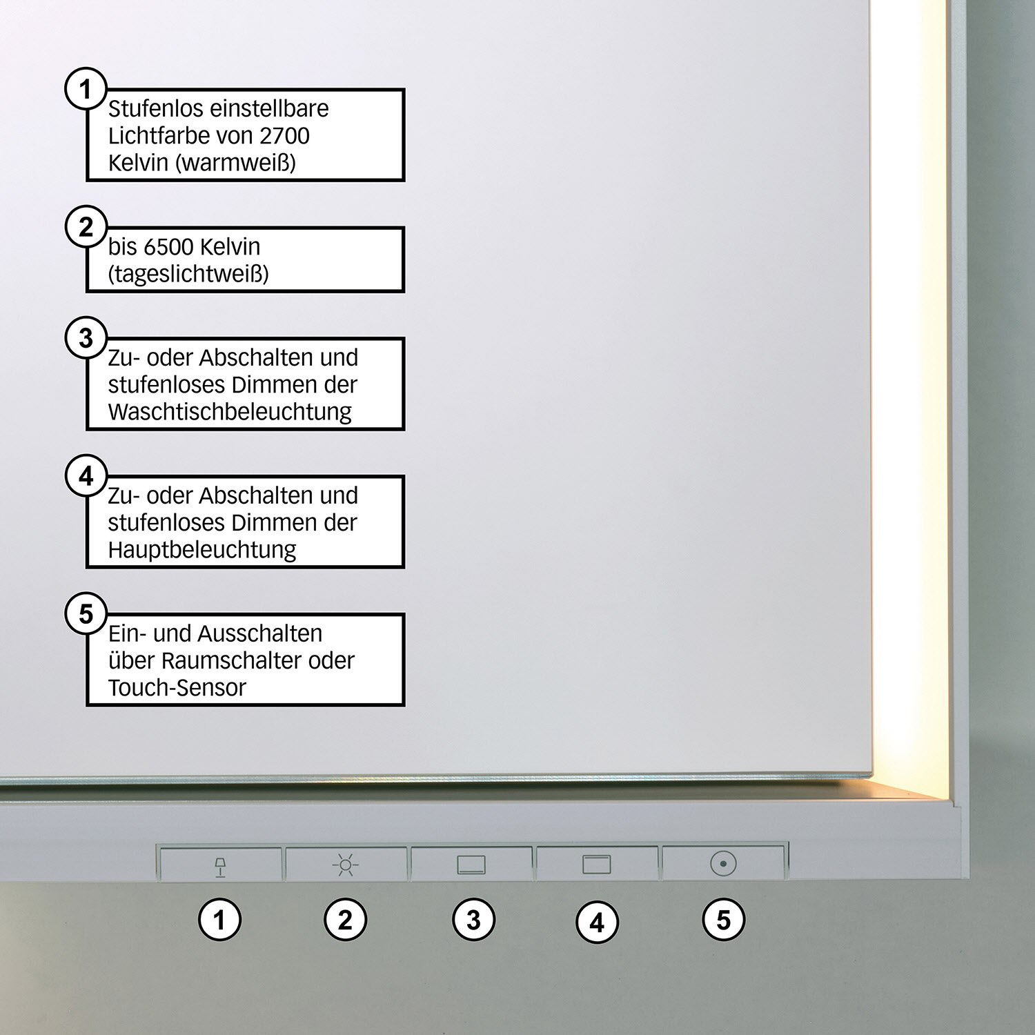 - Hauptbeleuchtung und Waschtisch- / Fachbeleuchtung separat dimmbar und schaltbar