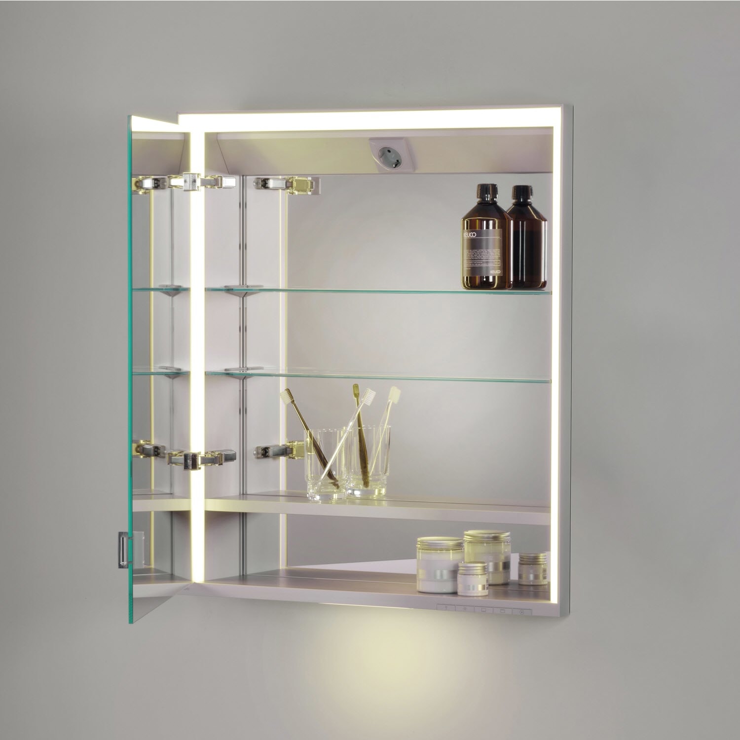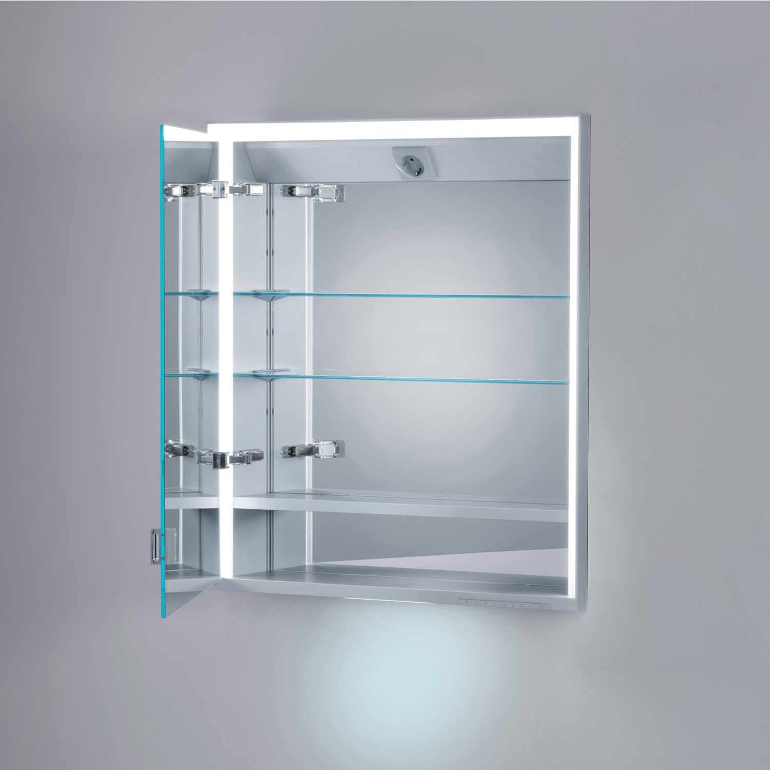 - Rahmenbeleuchtung (seitlich und oben) und Waschtisch-/Fachbeleuchtung separat dimmbar und schaltbar