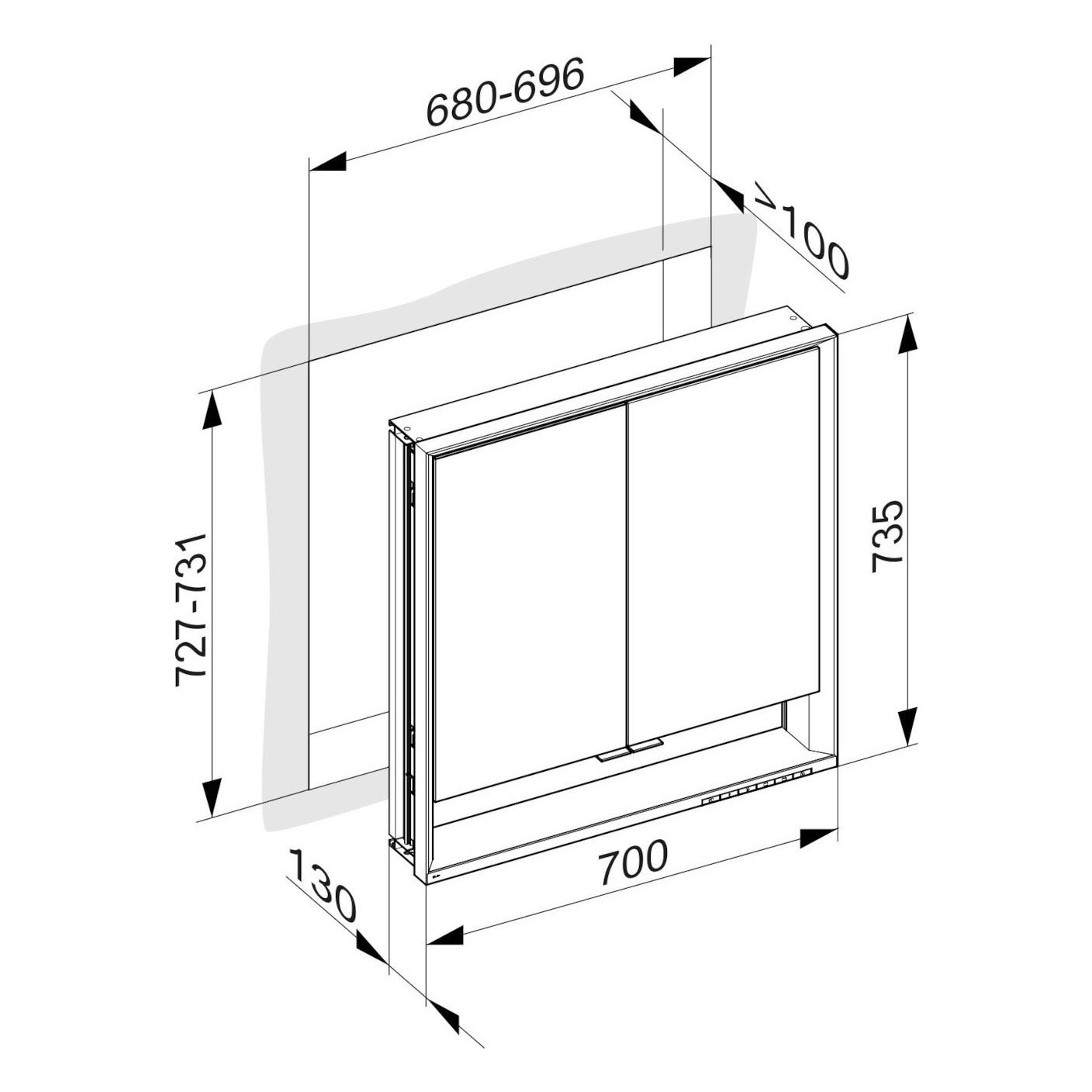 - Spiegelschrank zum Wandeinbau. Wandausschnitt: B: 68-69,6 T: >10 H: 72,7-73,1 cm