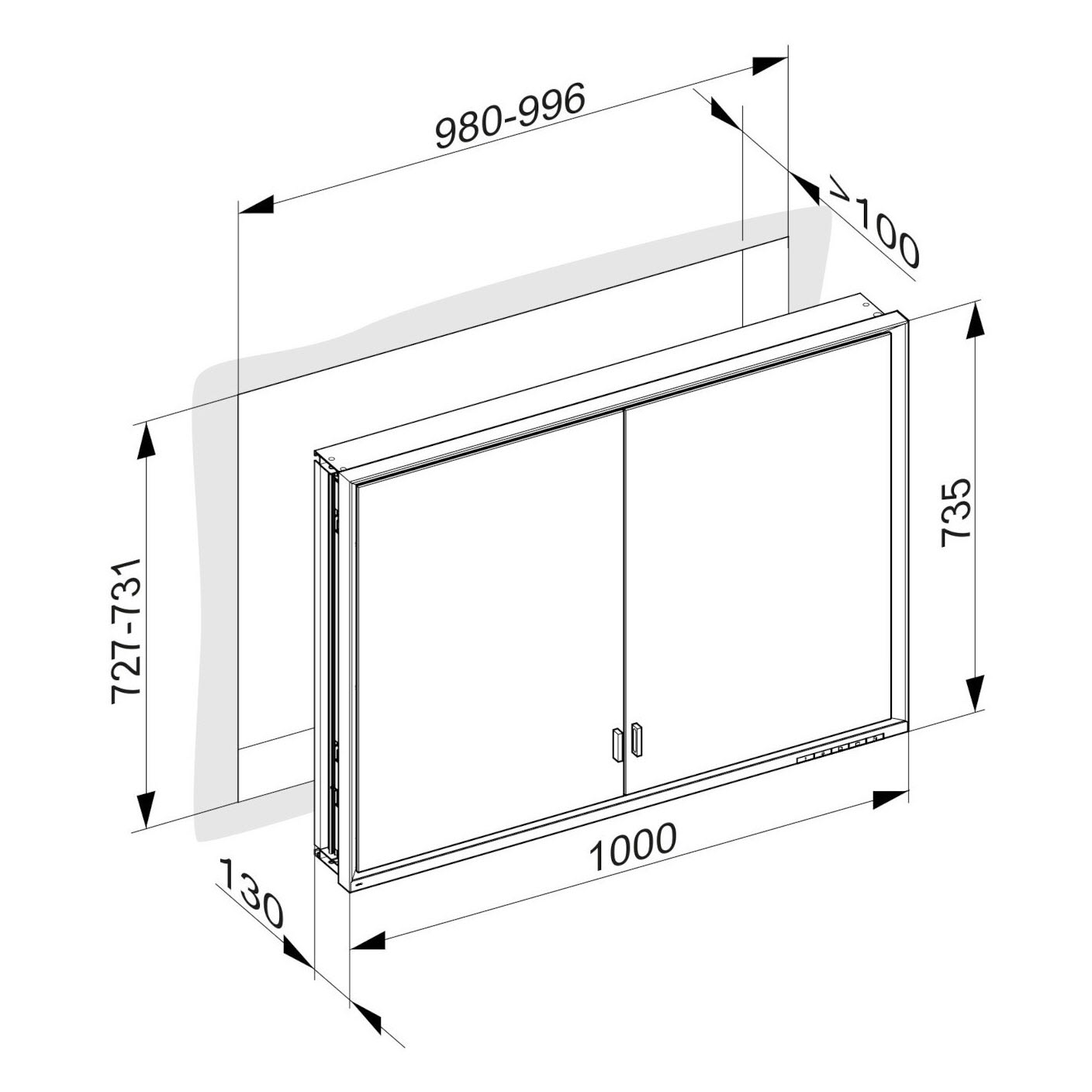 - Spiegelschrank zum Wandeinbau. Wandausschnitt: B: 98-99,6 T: >10 H: 72,7-73,1 cm