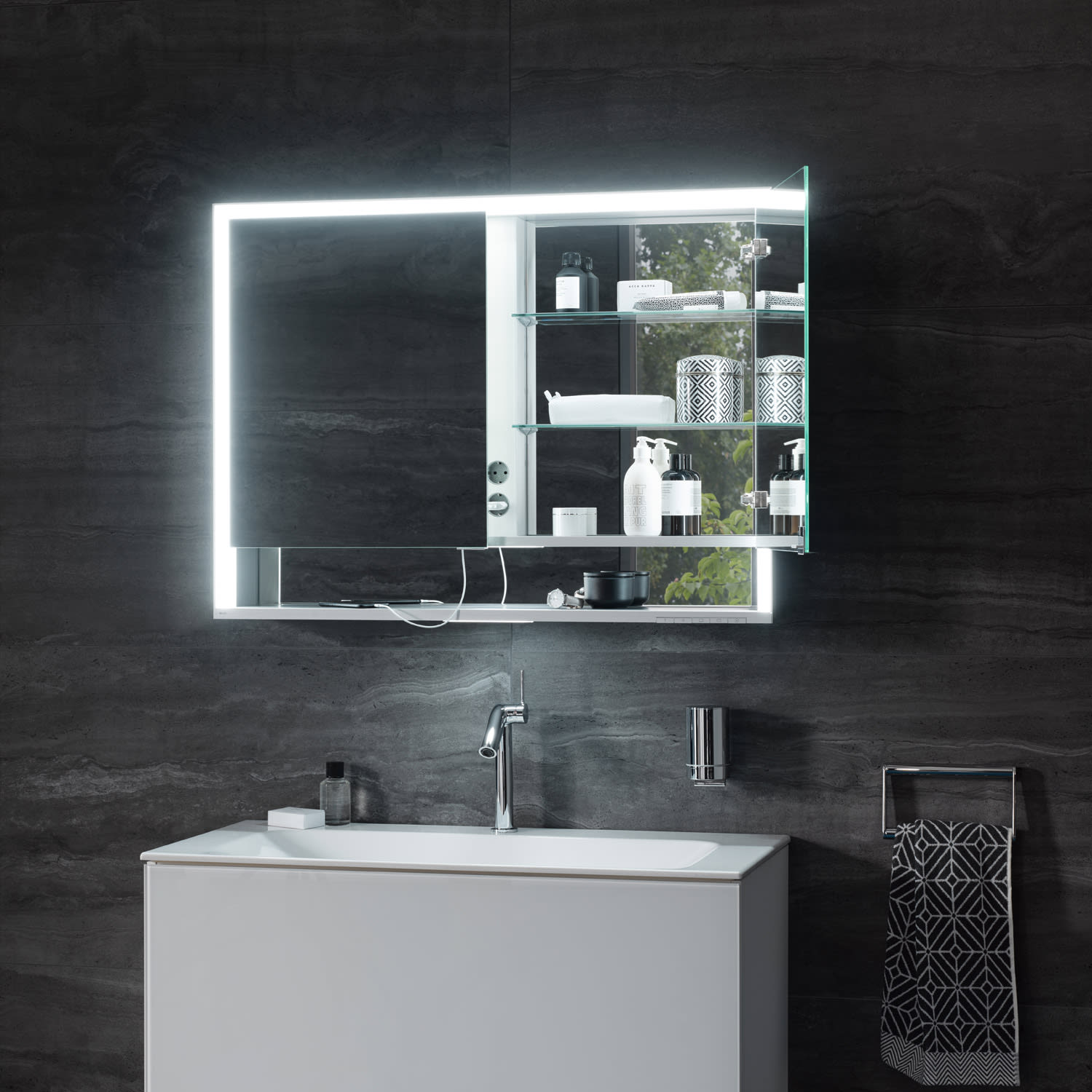 - Hauptbeleuchtung und Waschtisch- / Fachbeleuchtung separat dimmbar und schaltbar