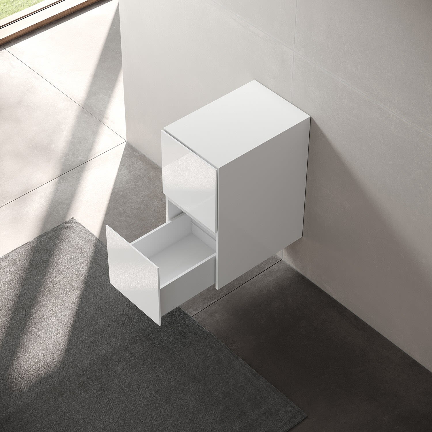 - Das Sideboard kann als Einzelschrank an der Wand montiert aber auch als Anbauschrank direkt mit einem Waschtuschunterbau verbunden werden.