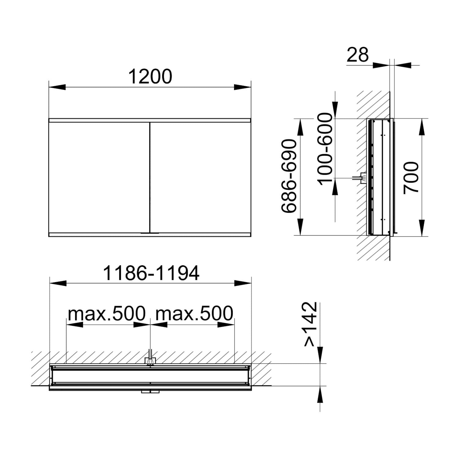 - Wandausschnitt: B: 118,6-119,4 T: min.14,2 H: 68,6-69 cm