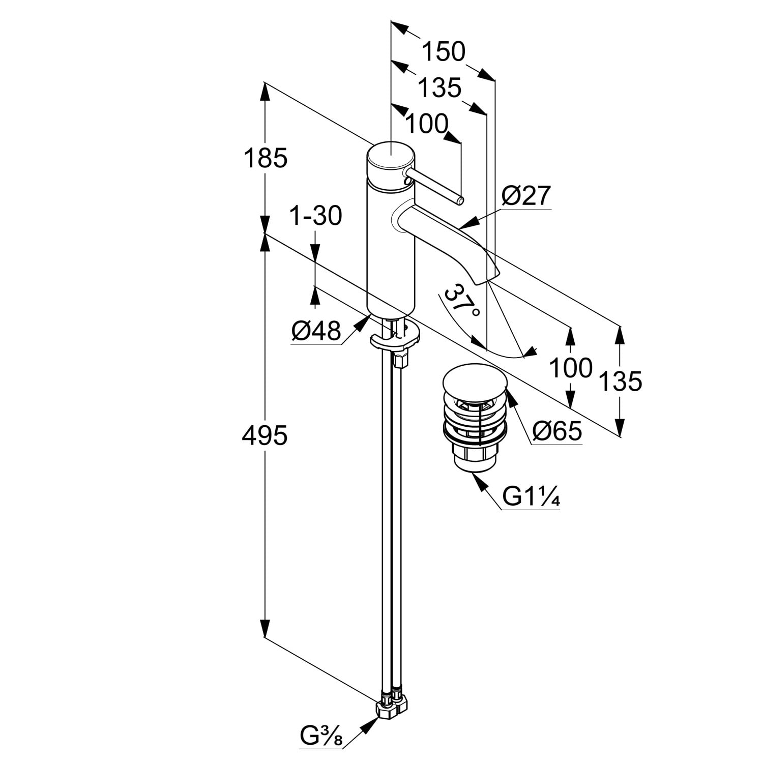 Kludi BOZZ Bidet-Einhandmischer mit Zugstangen-Ablaufgarnitur
