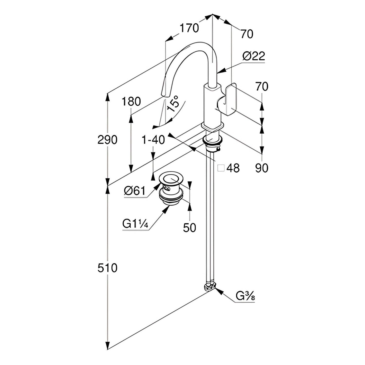 Herzbach DEEP Waschtischmischer Slim M-Size Griff seitlich mit PUSH-Ablaufventil