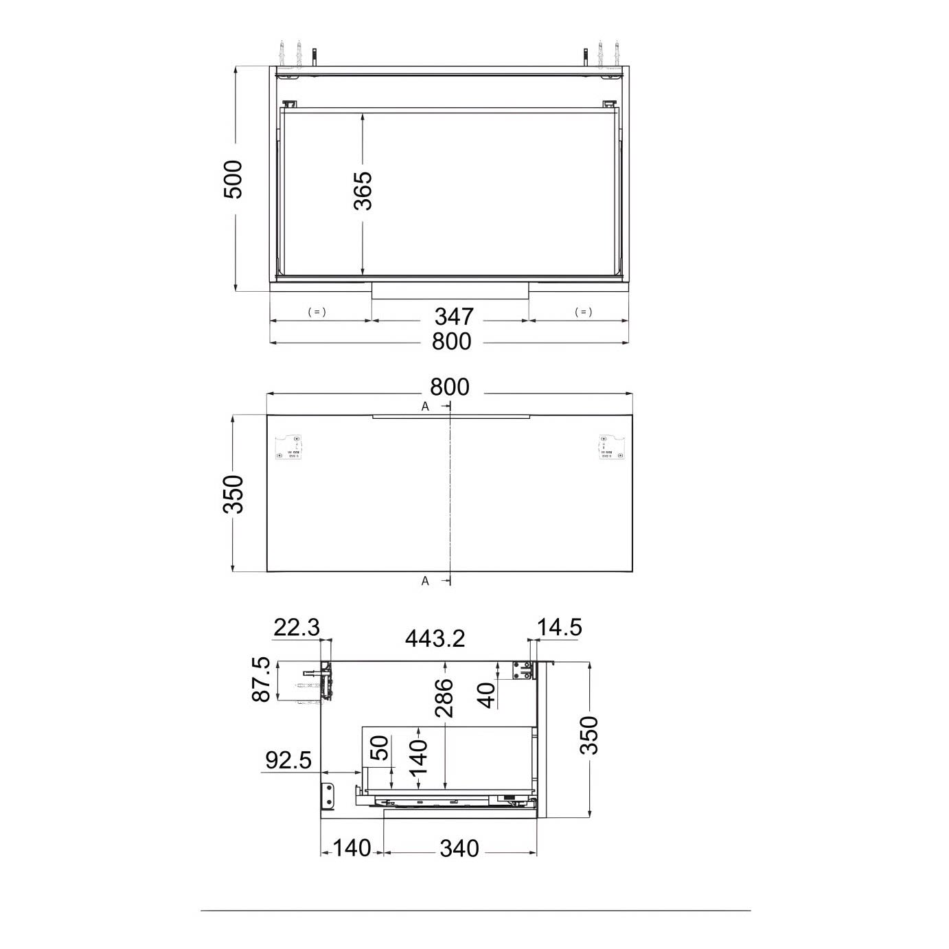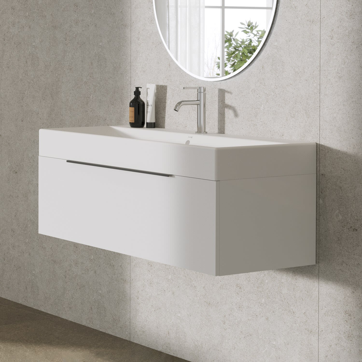 - Waschtischunterschrank: MDF mit Melaminbeschichtung, mit 1 Softclose-Auszug, Griffleiste aus Aluminium in schwarz matt