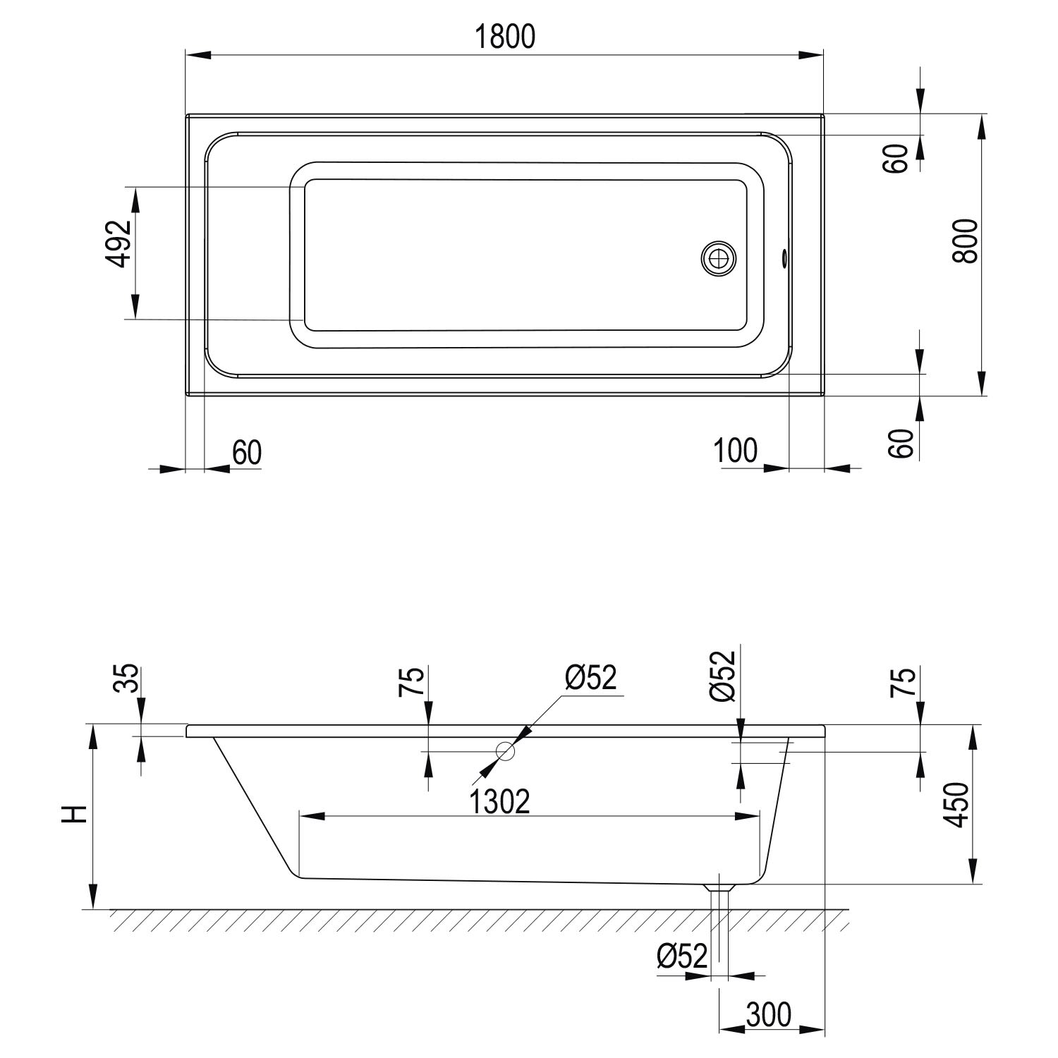 Koralle T350 Badewanne 180 x 80 x 45 ohne Schürze mit Fußablauf, mit Bohrung nach Zeichnung