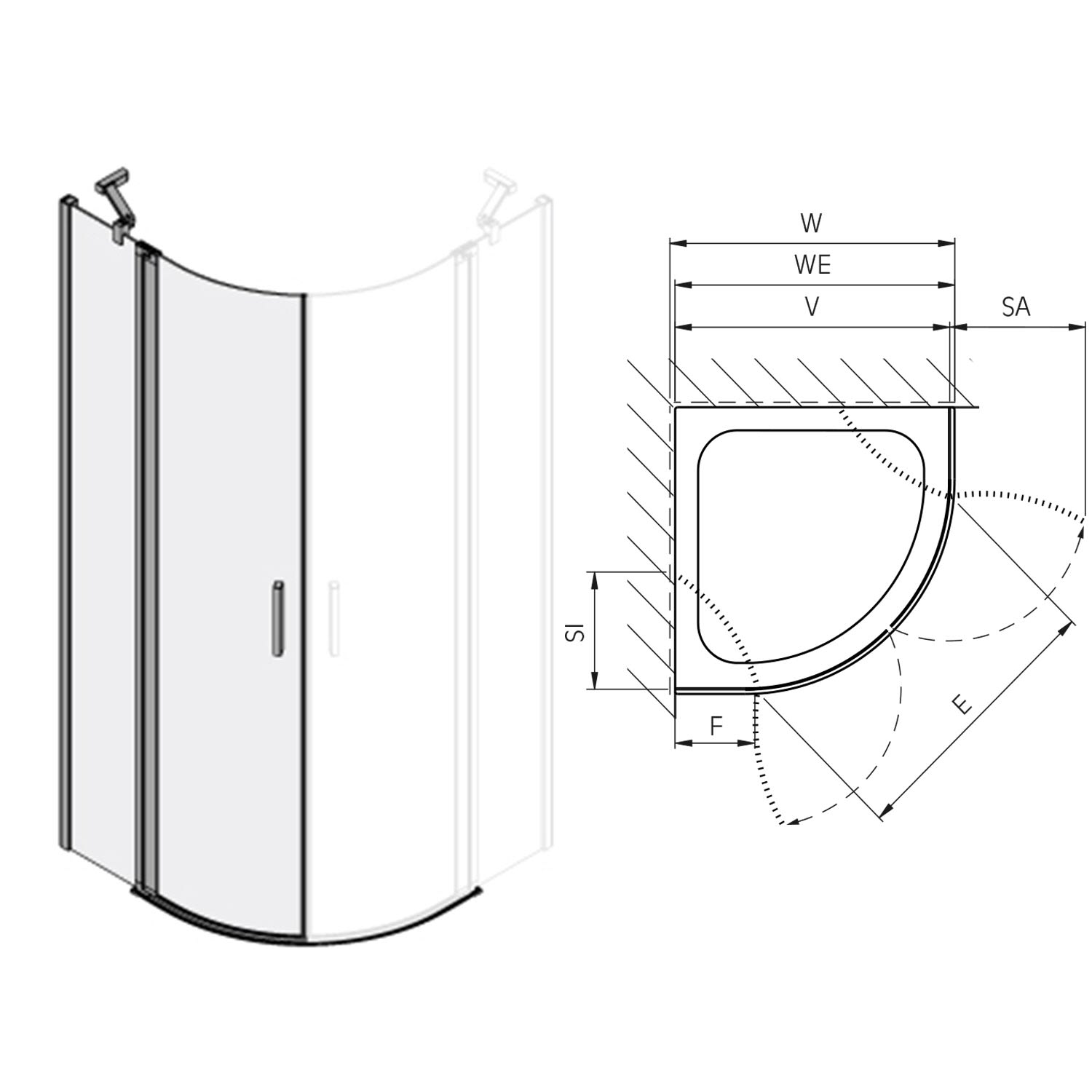 Koralle SL450 Viertelkreis Pendeltür mit Festteil links, Typ VPFBOS L 100, 100 x 200 cm, R= 55 cm, bodengleich