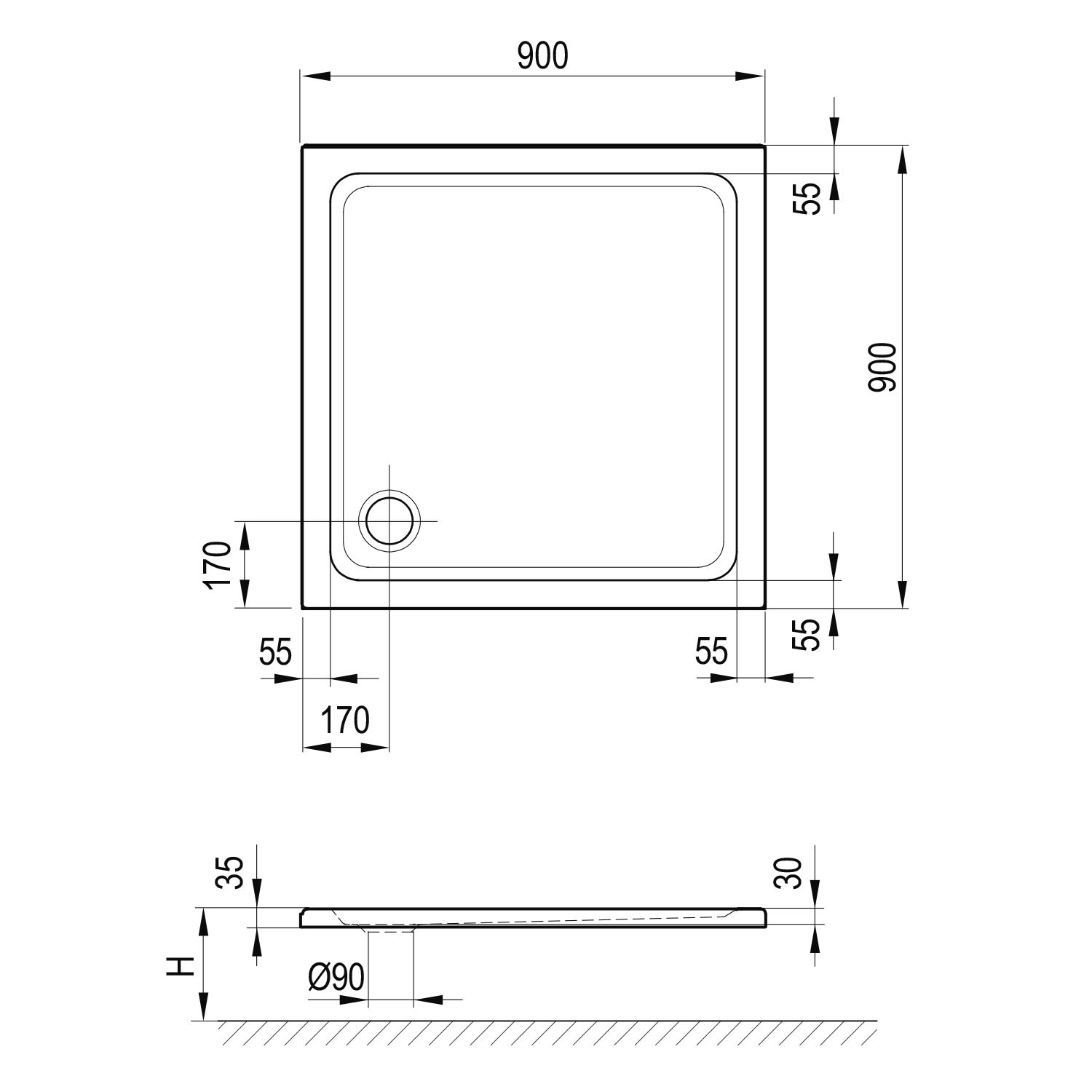 Koralle T350 Duschwanne 90 x 90 x 3 ohne Schürze