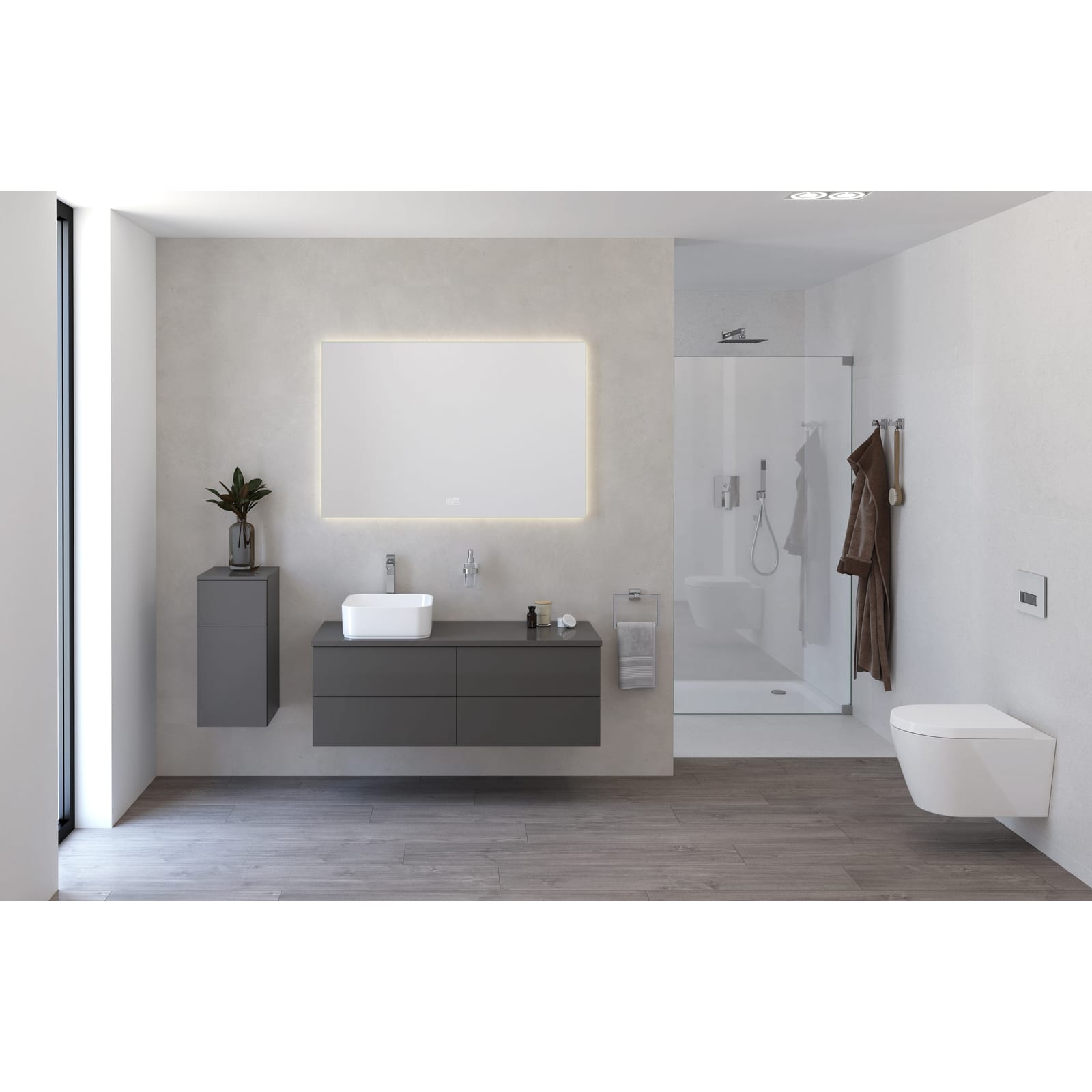 - Front: MDF-Kern mit Melaminharzdirektbeschichtung, Vorderseite zusätzlich mit einem einschichtigen Hochglanz UV-Acryllack beschichtet, Kanten umlaufend mit einer glänzenden Kunststoffdickkante belegt