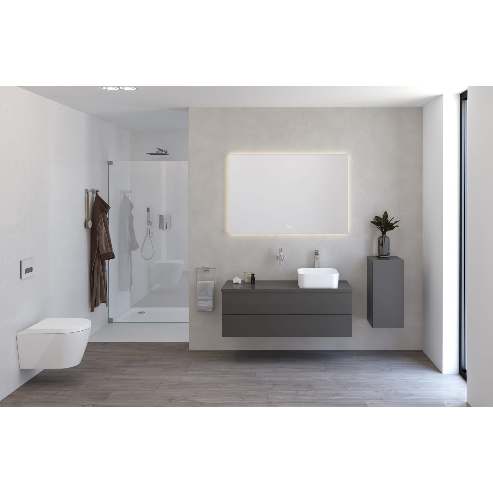 - Front: MDF-Kern mit Melaminharzdirektbeschichtung, Vorderseite zusätzlich mit einem einschichtigen Hochglanz UV-Acryllack beschichtet, Kanten umlaufend mit einer glänzenden Kunststoffdickkante belegt