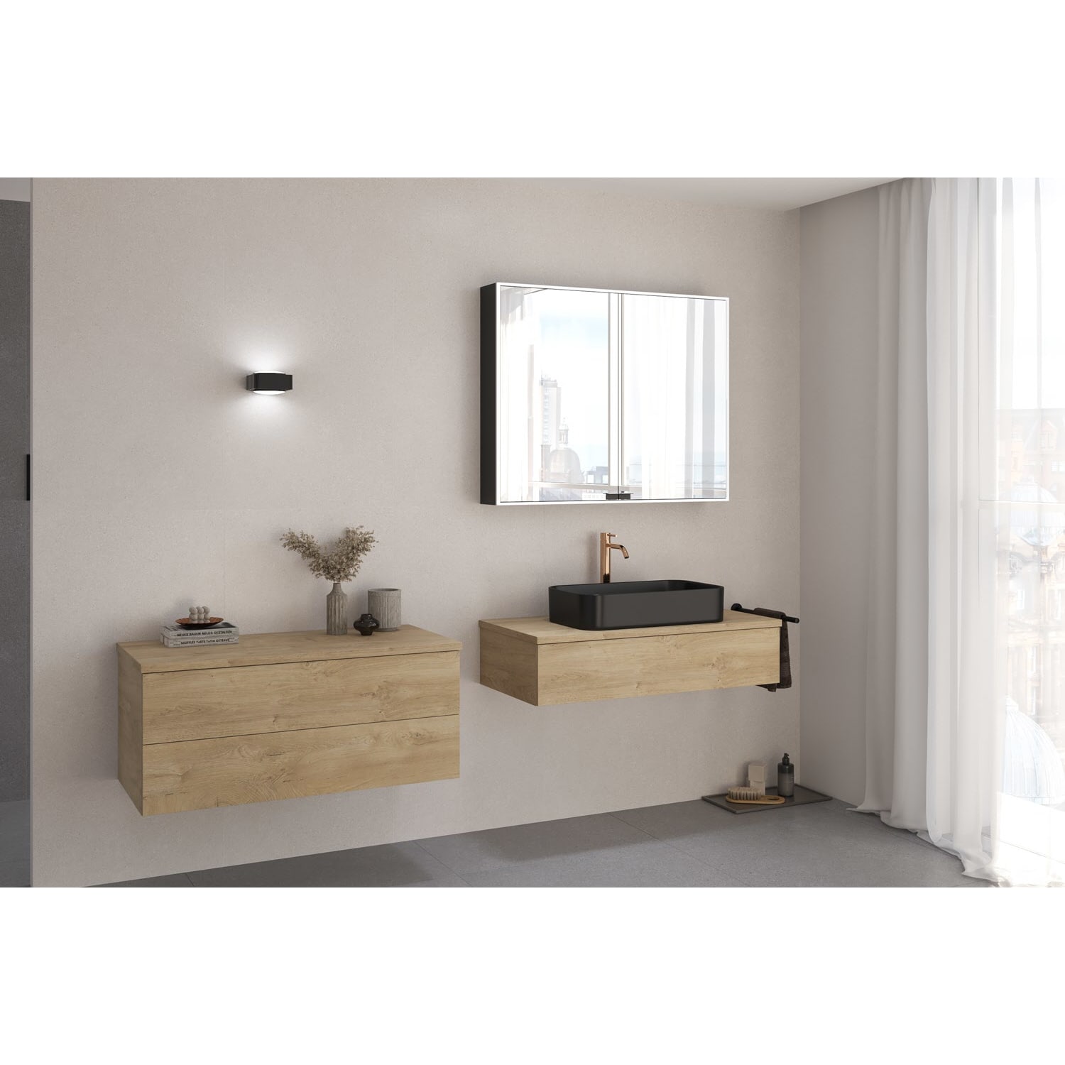 Der Korpuskern besteht aus einer Holzwerkstoffplatte. Die spezielle Melaminharzbeschichtung auf der Oberfläche bietet Schutz gegen Feuchtigkeit, Hitze und haushaltsübliche Beanspruchungen. Für eine dauerhafte Stabilität ist der Korpus mehrfach gedübelt. Die Waschtischplatte hat einen mehrschichtigen Aufbau. Dieser Schichtstoff ist härter, extrem widerstandsfähig, hygienisch, pflegeleicht, feuchtigkeitsunempfindlich und hält über Jahre selbst großen Alltagsbelastungen stand.