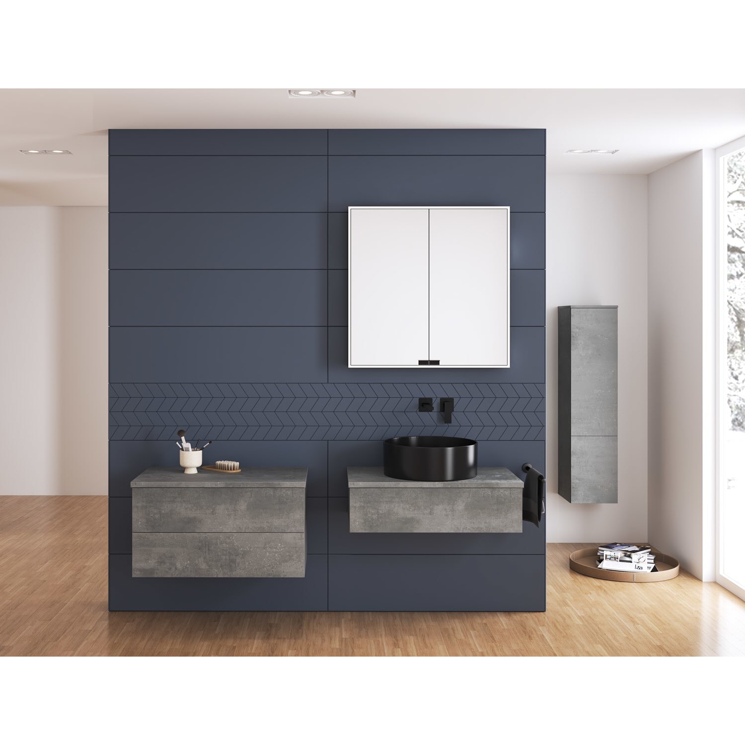Der Korpuskern besteht aus einer Holzwerkstoffplatte. Die spezielle Melaminharzbeschichtung auf der Oberfläche bietet Schutz gegen Feuchtigkeit, Hitze und haushaltsübliche Beanspruchungen. Für eine dauerhafte Stabilität ist der Korpus mehrfach gedübelt. Die Waschtischplatte hat einen mehrschichtigen Aufbau. Dieser Schichtstoff ist härter, extrem widerstandsfähig, hygienisch, pflegeleicht, feuchtigkeitsunempfindlich und hält über Jahre selbst großen Alltagsbelastungen stand.