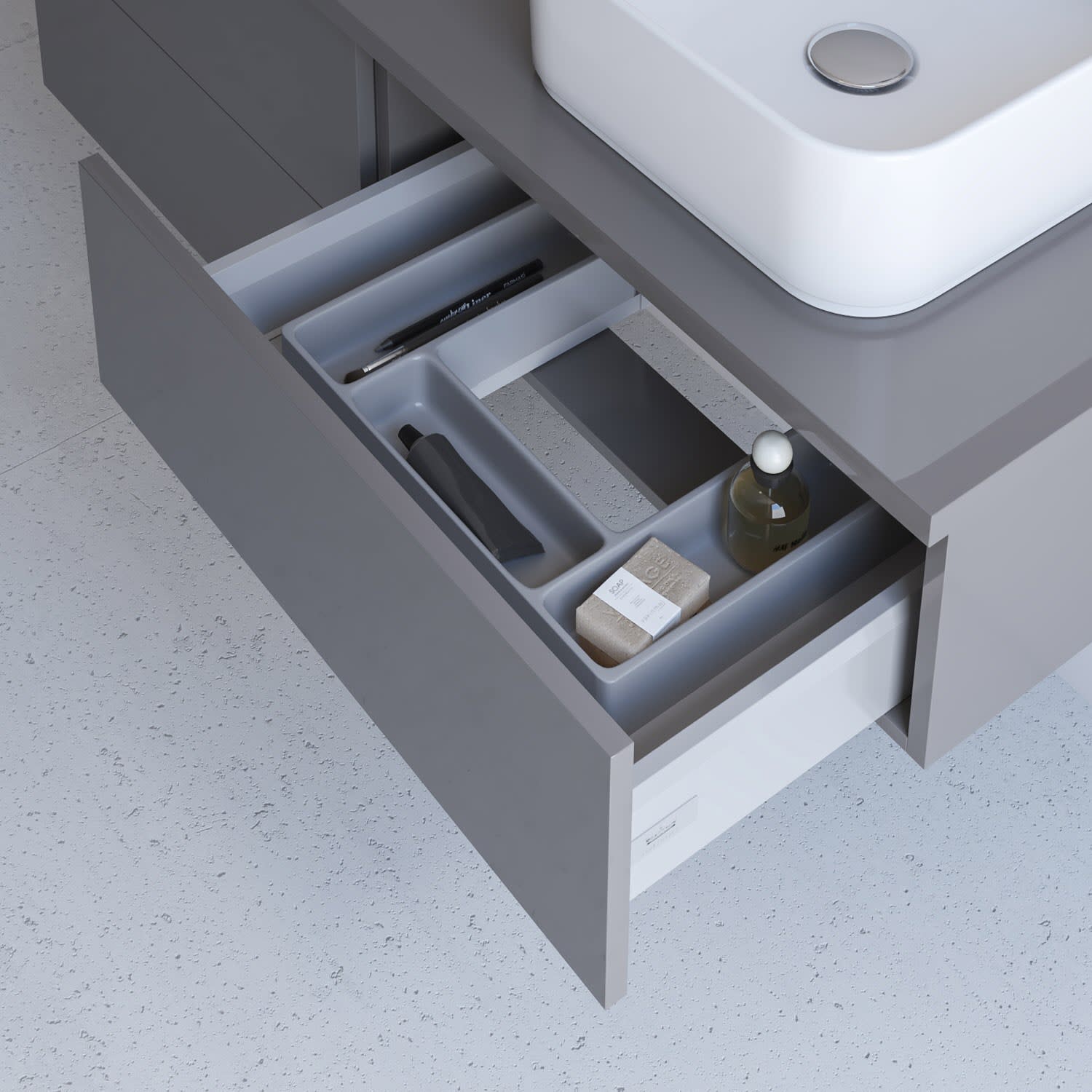 Die Innenausstattung ist grundsätzlich gedämpft und beinhaltet Blum ANTARO-Schubkästen sowie Auszüge in oriongrau als Vollauszüge mit farblich abgestimmtem Kosmetikeinsatz.