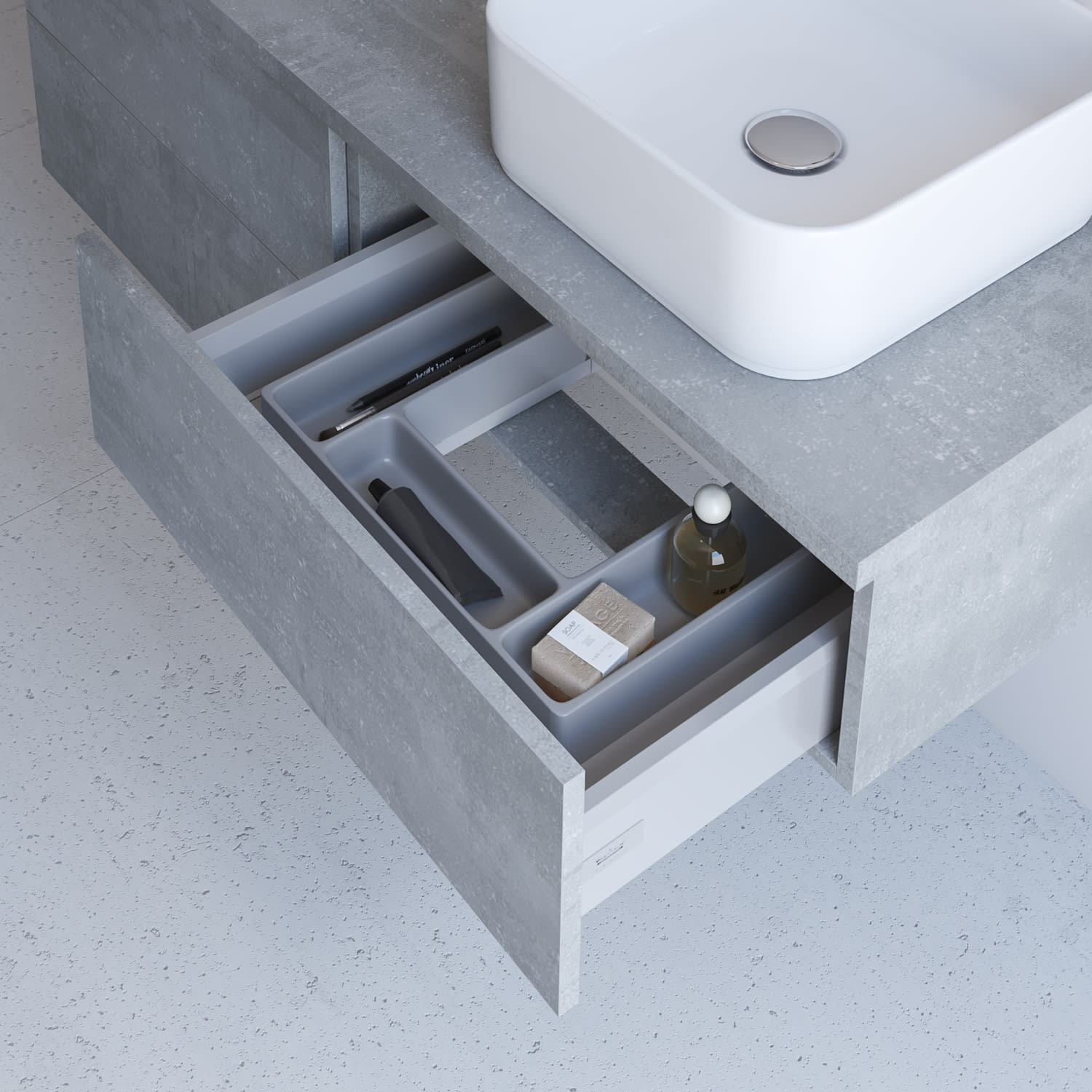 Die Innenausstattung ist grundsätzlich gedämpft und beinhaltet Blum ANTARO-Schubkästen sowie Auszüge in oriongrau als Vollauszüge mit farblich abgestimmtem Kosmetikeinsatz.