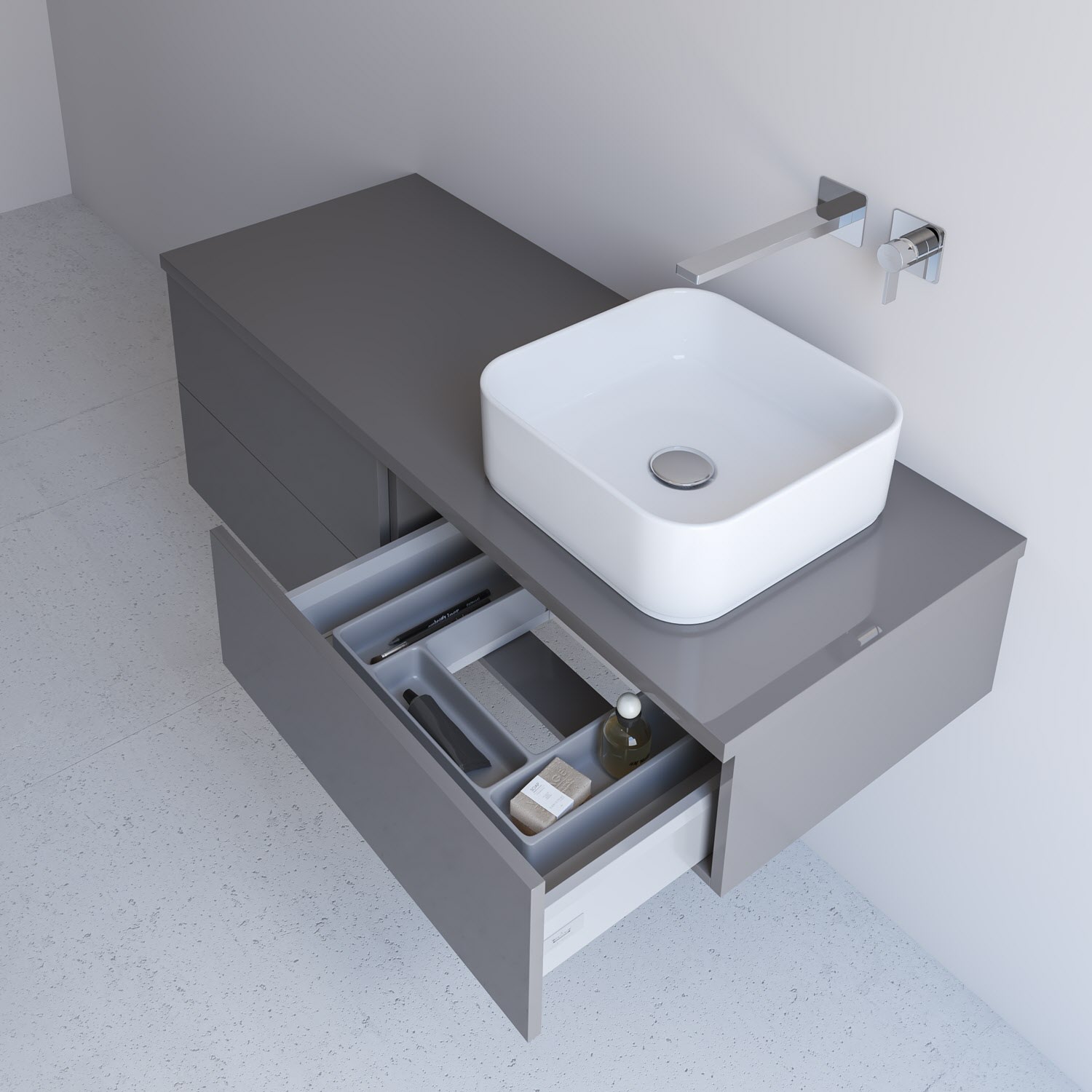 Die Innenausstattung ist grundsätzlich gedämpft und beinhaltet Blum ANTARO-Schubkästen sowie Auszüge in oriongrau als Vollauszüge mit farblich abgestimmtem Kosmetikeinsatz.