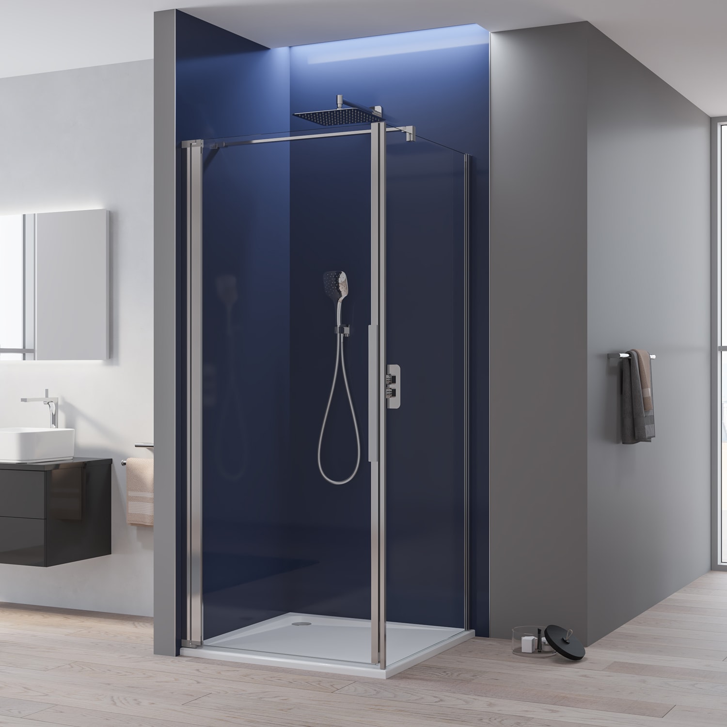 - Für eine vollständige Duschabtrennung werden zwei Halbteile benötigt!