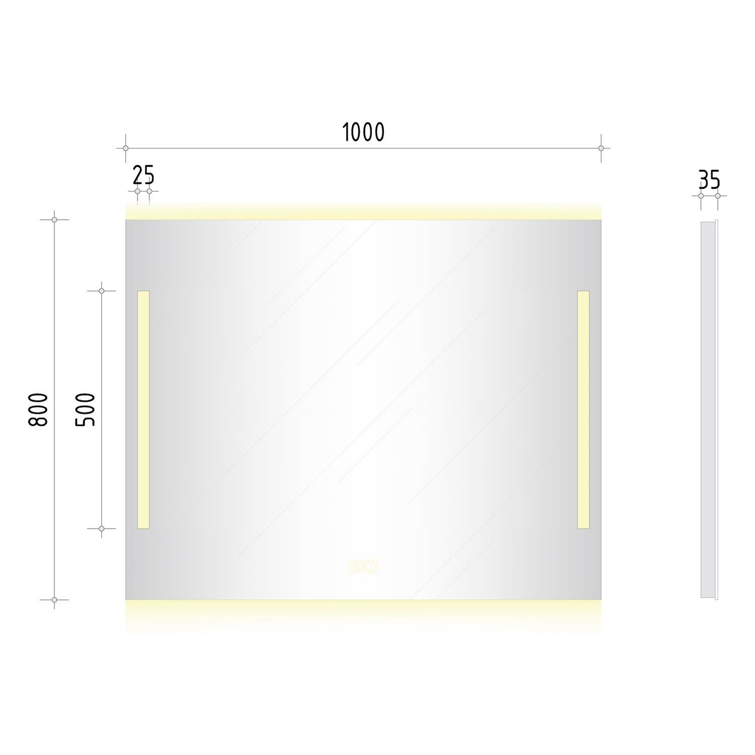 - mit in die Spiegelfläche integrierten Touch-Schaltern für an/aus, Dimmfunktion und Antibeschlag