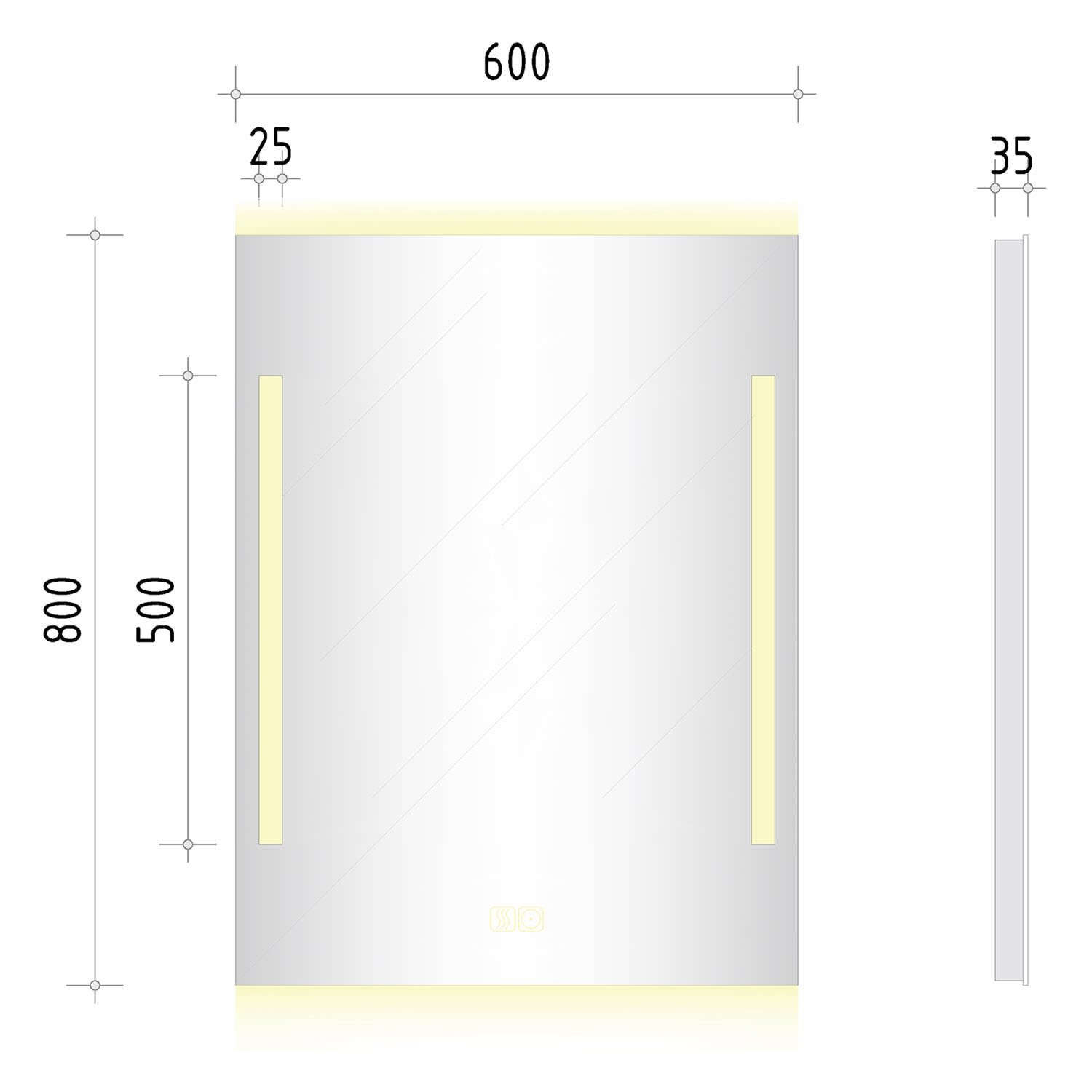 - mit in die Spiegelfläche integrierten Touch-Schaltern für an/aus, Dimmfunktion und Antibeschlag