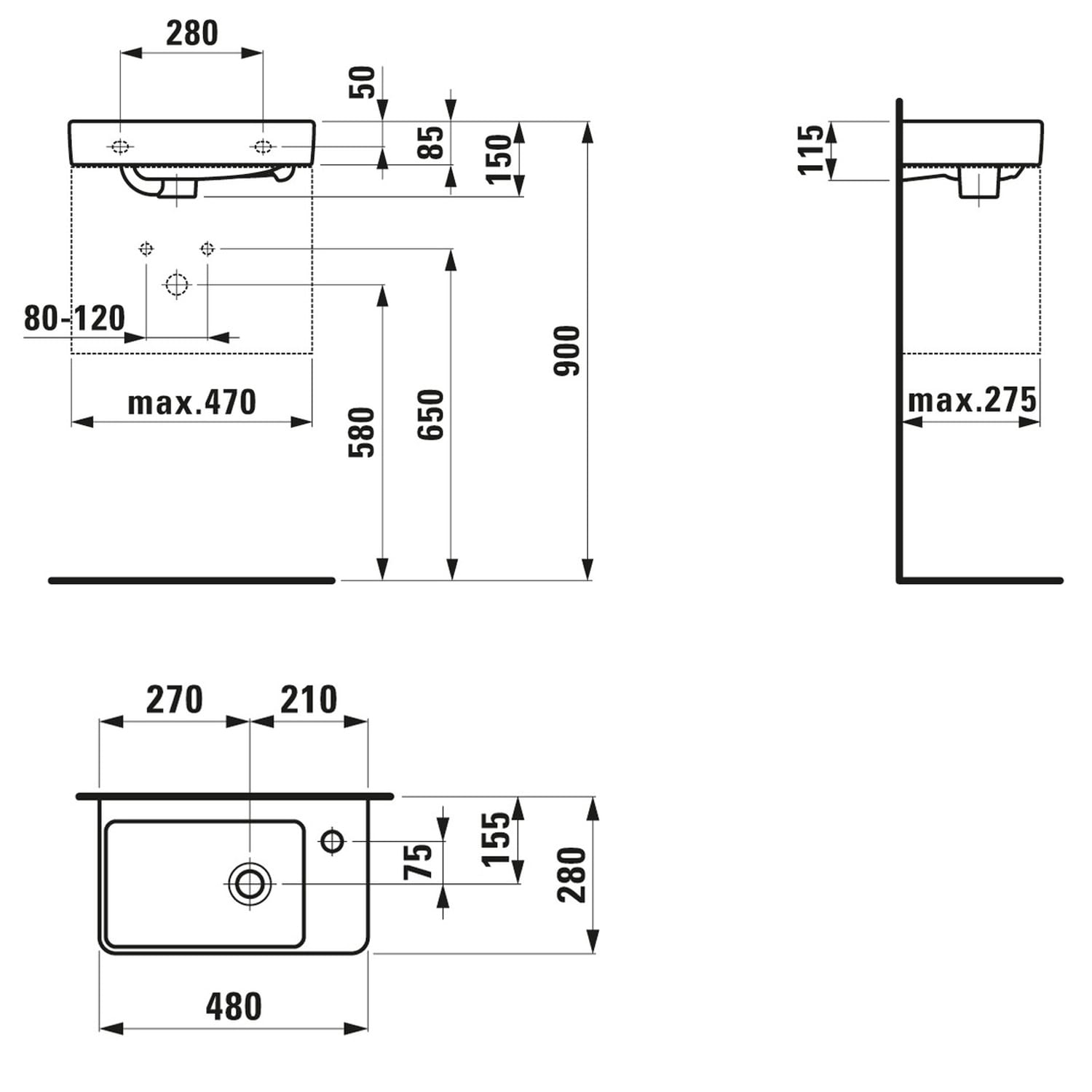 LAUFEN PRO S Handwaschbecken 48 cm asymmetrisch, mit 1 Hahnloch rechts, mit Überlauf, mit Becken links