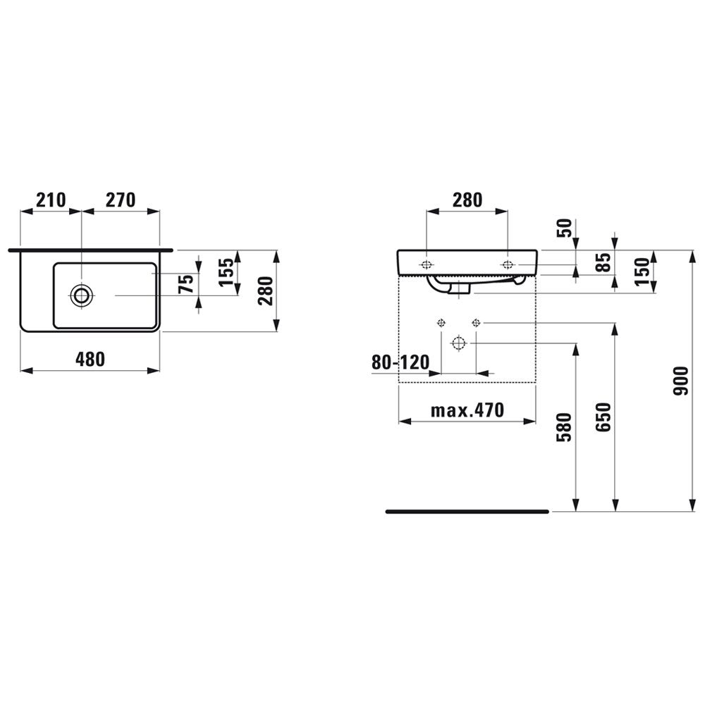 LAUFEN PRO S Handwaschbecken 48 cm asymmetrisch, ohne Hahnloch, mit Überlauf, mit Becken rechts