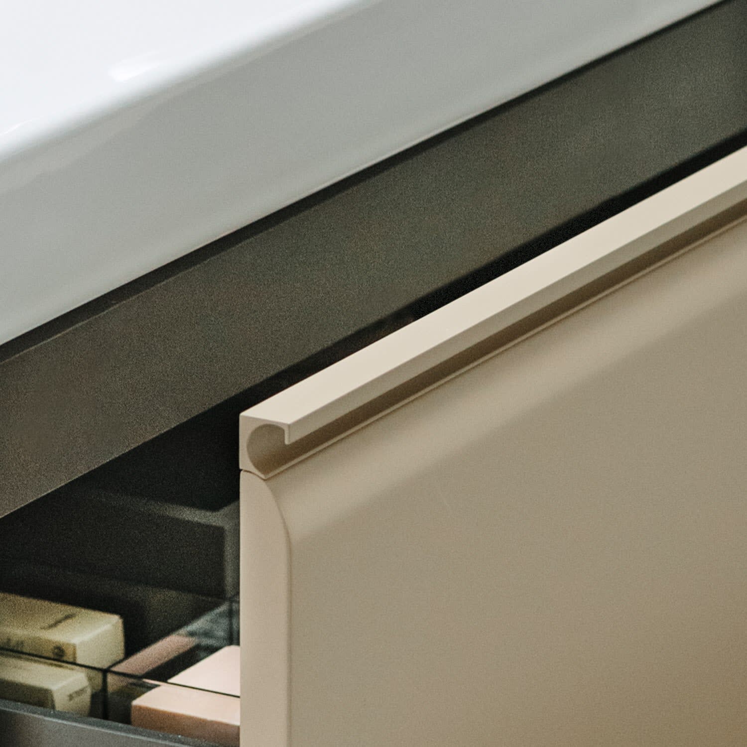 Der Waschtischunterschank besticht durch ein klares und geradliniges Design, das von schlanken Seitenwangen geprägt ist. Die geschwungene Front verleiht dem Schrank ein faszinierendes Wechselspiel von Lichtreflexion und Schattenlinie – ein wahrer Blickfang in jedem Badezimmer. Der Aluminiumgriff erfüllt sowohl ästhetische als auch praktische Funktionen. So ist dieser farblich perfekt auf die Möbeloberfläche abgestimmt und bietet zudem optimalen Halt und Schutz vor Staub und Wasser.