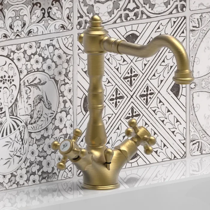 - „IOTA 2.0“-Zweigriff-Waschtischarmatur von Kronenbach: Das Design der Armatur ist deutlich verschnörkelter und verspielter und passt zu einer traditionellen Einrichtung.