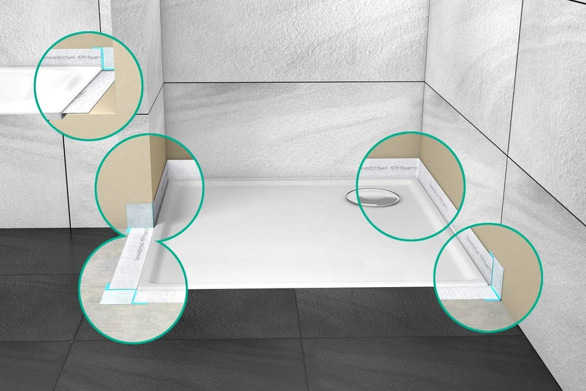 „Dichtstofffugen am Wannenrand stellen keine Abdichtung im Sinne dieser Norm dar.“. Als ordnungsgemäße Abdichtung werden zwei Optionen vorgeschlagen: Zum einen das „Anschließen des Wannenrandes an die Abdichtung, z.B. mit Wannenranddichtbändern bzw. Zargen“, zum anderen das „Fortführen der Abdichtung unter und hinter der Wanne, ggf. mit Unterflur-Entwässerung“.