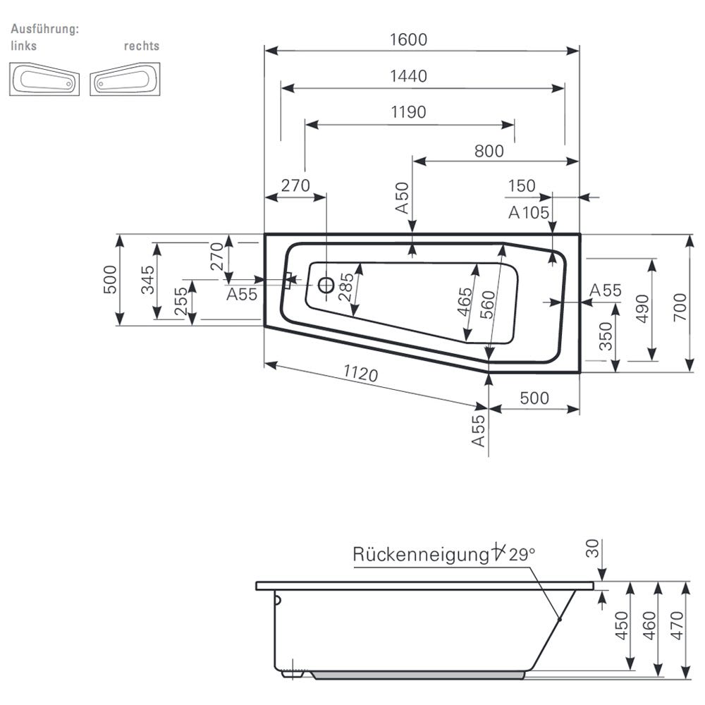 - Raumsparbadewanne aus hochwertigem Sanitäracryl nach DIN EN 263
