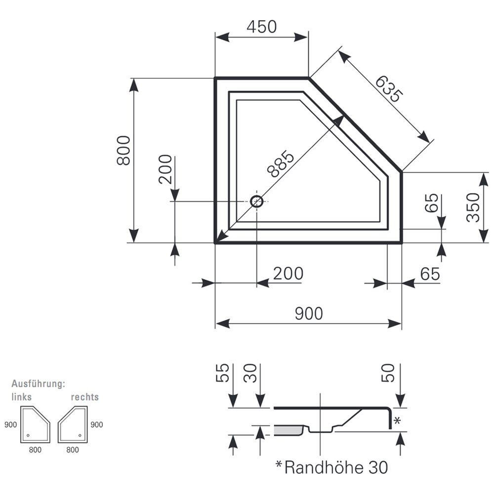 Mauersberger Fünfeck-Duschwanne Circi 90 x 80 superflach rechts