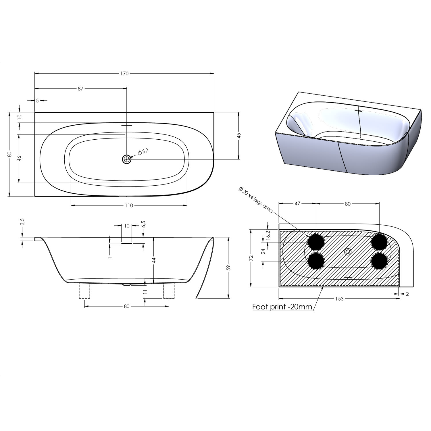 - die Acrylwanne besteht aus hochwertigem 5 mm Acryl, sind durch und durch verstärkt und weiß gefärbt